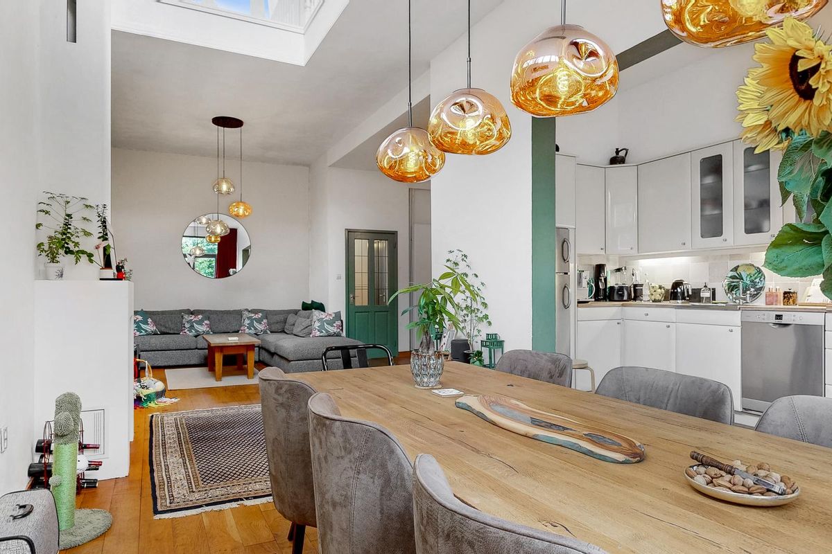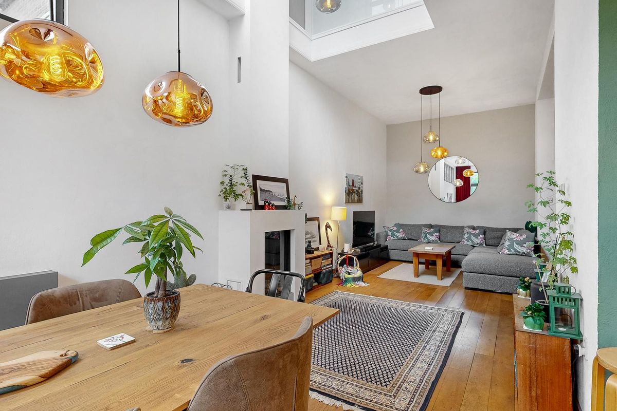 De L-vormige woon-/eetkamer is een verrassend licht en luchtig geheel, dankzij de hoge vide en de grote ramen in de zijgevel die de zon prachtig binnenlaten. De open keuken is modern uitgerust met diverse inbouwapparatuur en via de openslaande deuren stap je zo de zonnige achtertuin in.