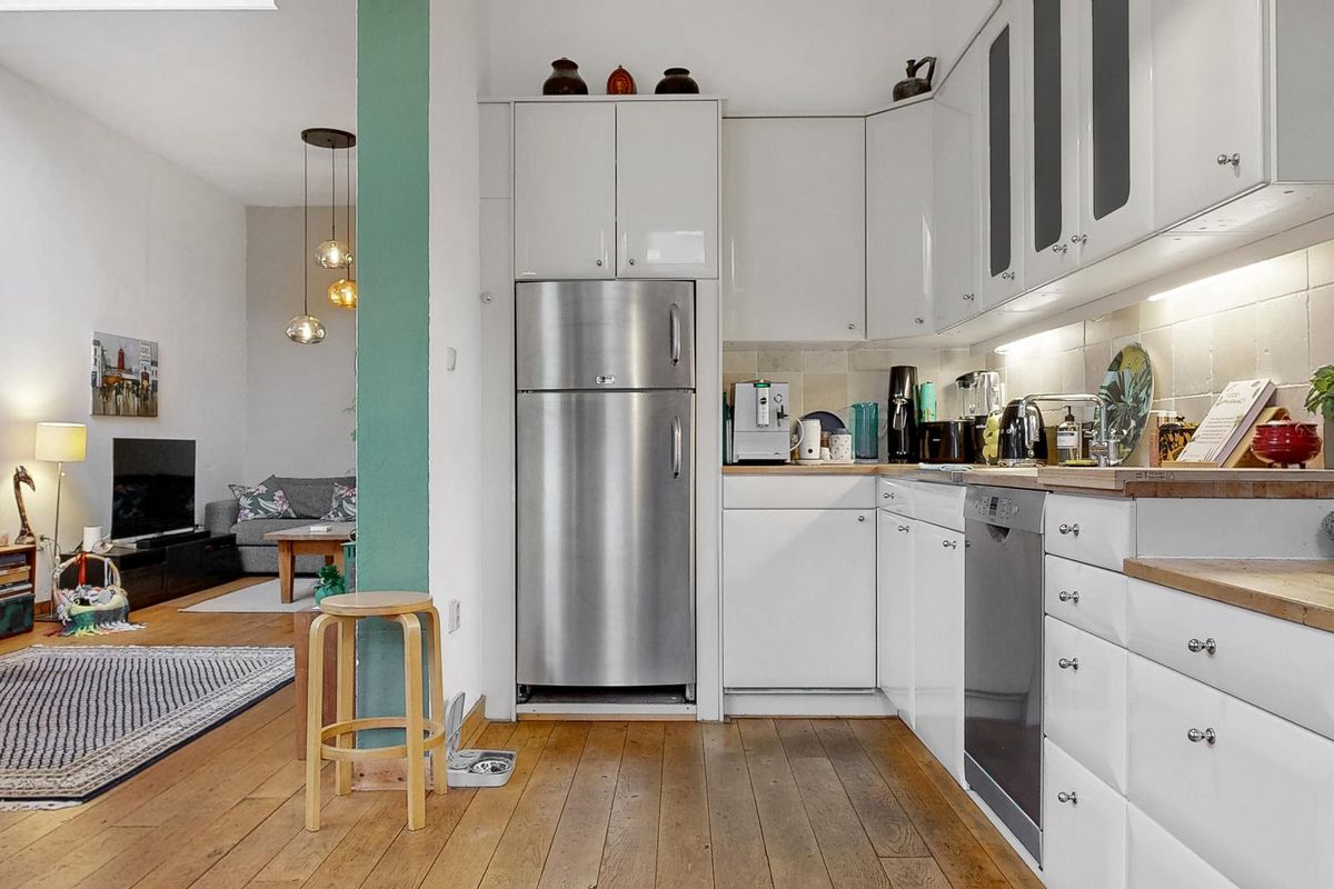 The L-shaped living/dining room is surprisingly light and airy, thanks to the extraordinary high ceiling and large windows in the side wall that let in plenty of sunlight. The open kitchen is modernly equipped with various built-in appliances, and French doors lead directly to the sunny backyard.