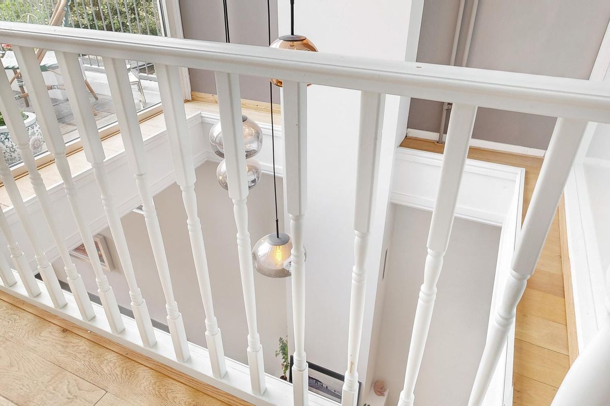 Via het strak gestucte en recent geschilderde trappenhuis bereik je de eerste verdieping. Aan de voorzijde bevindt zich de royale master bedroom over de volledige breedte, voorzien van een erker en een vaste kastenwand. De onlangs gerenoveerde, luxe badkamer is uitgerust met een ligbad, ruime inloopdouche en dubbele wastafel. Aan de vide ligt een prettige kantoorruimte met toegang tot het ruime terras. Aan de achterzijde bevindt zich een tweede slaapkamer en in de gang een tweede moderne toilet.