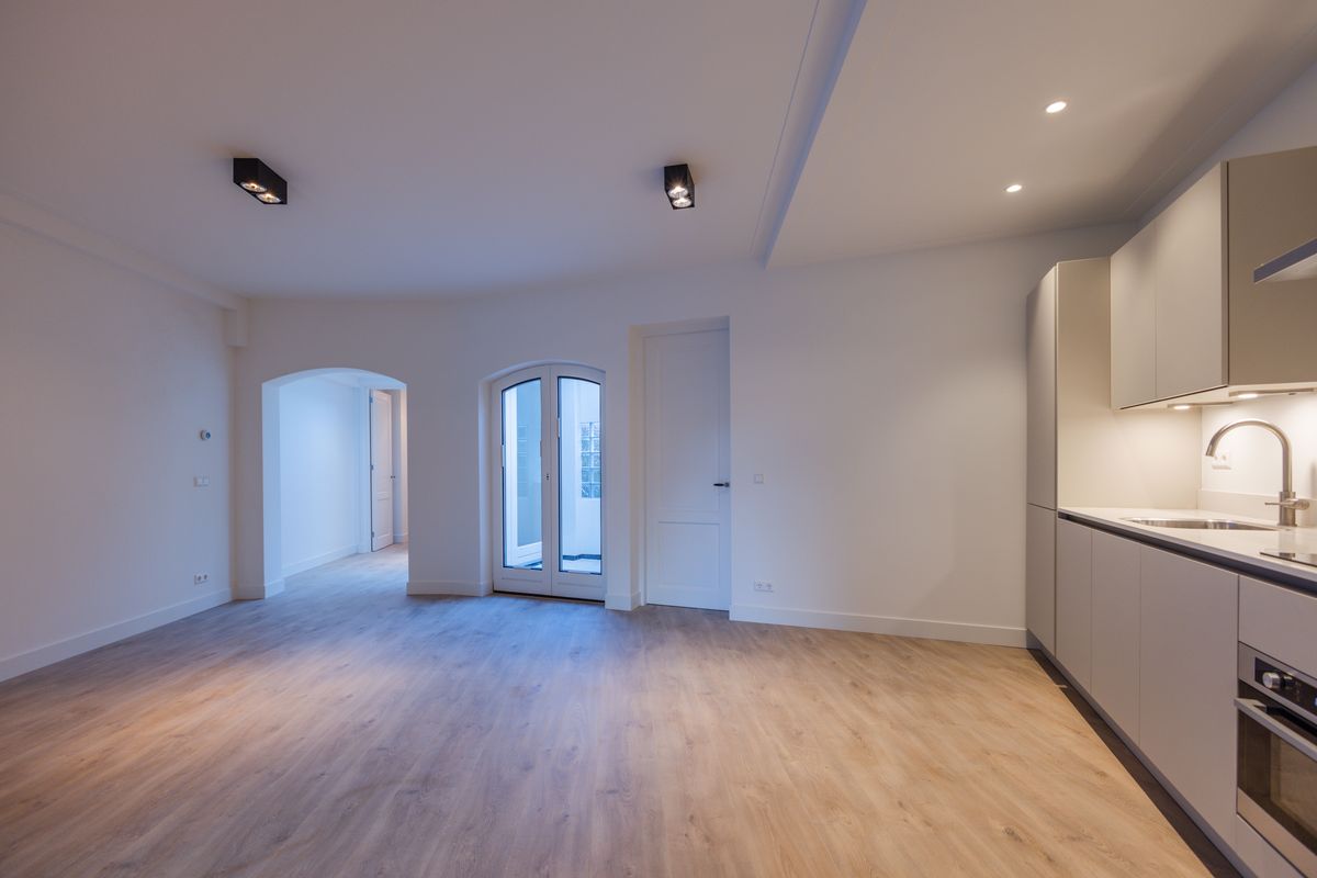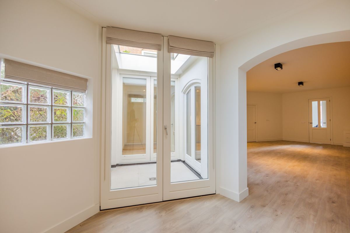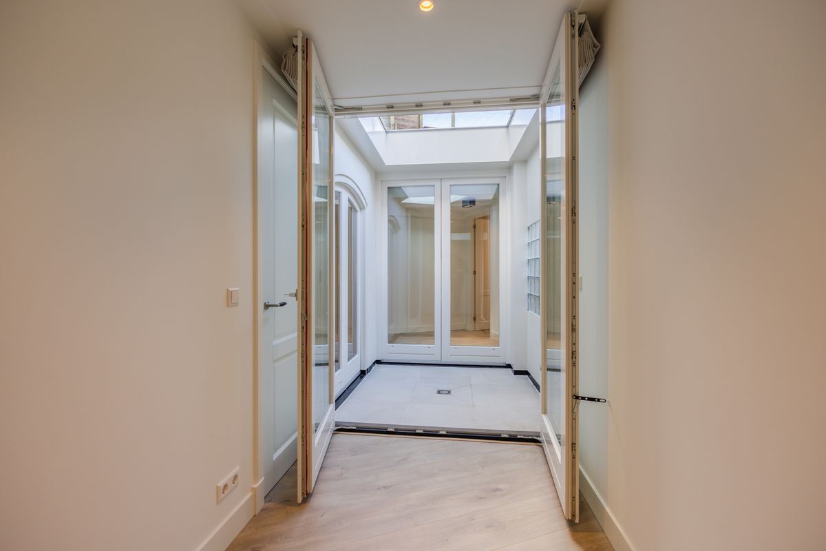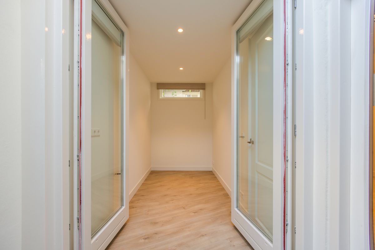 Binnenkomst in de royale woonkamer met open moderne keuken. Aan de achterzijde een moderne patio die de ruimte van aangenaam daglicht voorziet. Op de begane grond bevindt zich aan de achterzijde een kleine ruimte die uitzicht heeft op de patio. Ideal als werkkamer. De keuken is modern en voorzien van alle benodigde inbouwapparatuur, zoals een combi oven-magnetron, inductie kookplaat, afzuigkap, vaatwasser, koelkast en vriezer.Aan de achterzijde is de slaapkamer gelegen. Deze kamer geeft toegang tot de stadse patio.