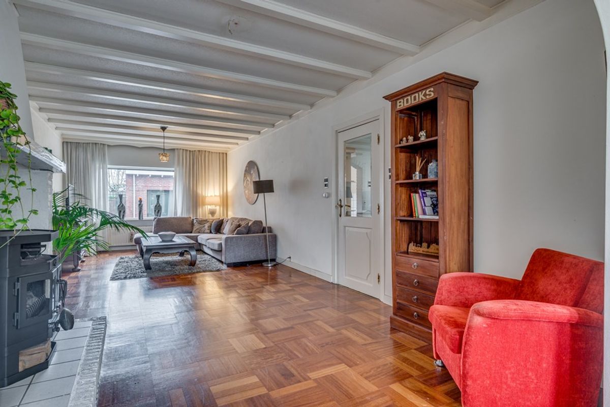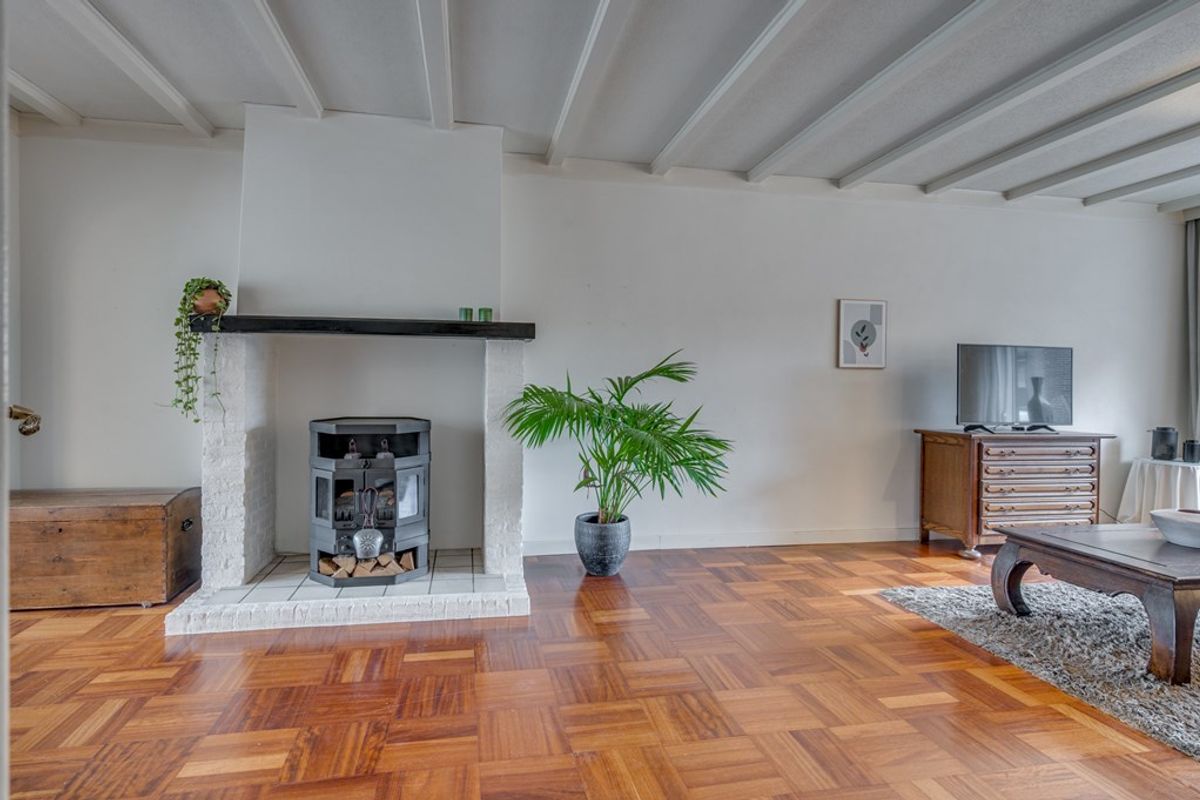 Via de ruime hal/entree bereik je het toilet met fonteintje en de toegang tot de leefruimtes. De uitgebouwde woonkamer is sfeervol ingericht en voorzien van een fraaie parketvloer en een houtkachel, wat zorgt voor extra warmte en gezelligheid.