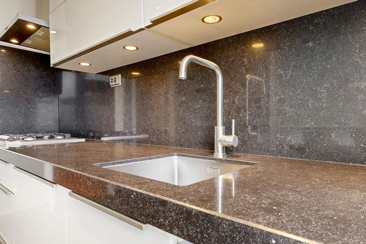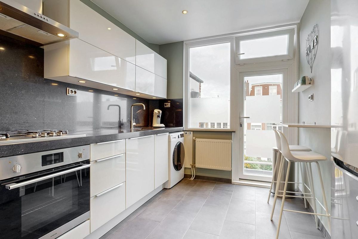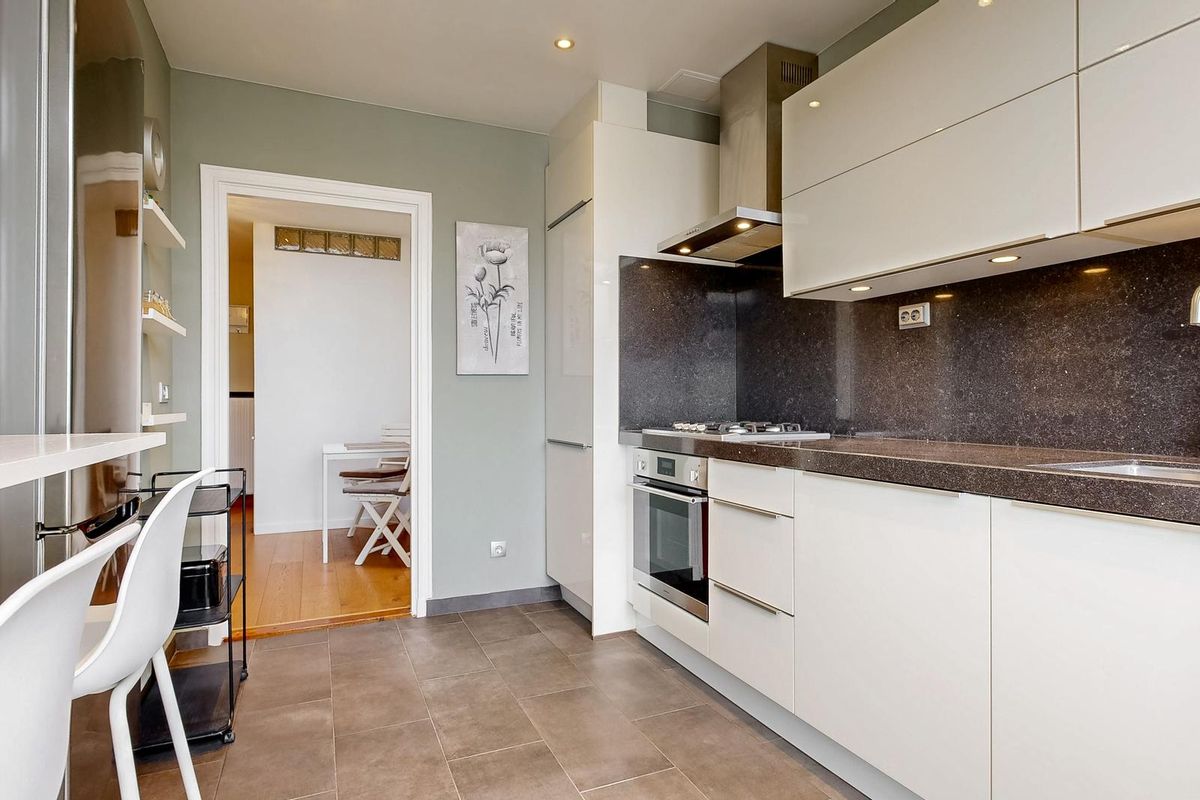 De moderne, ruime keuken is voorzien van diverse inbouwapparatuur en geeft toegang tot het brede balkon.