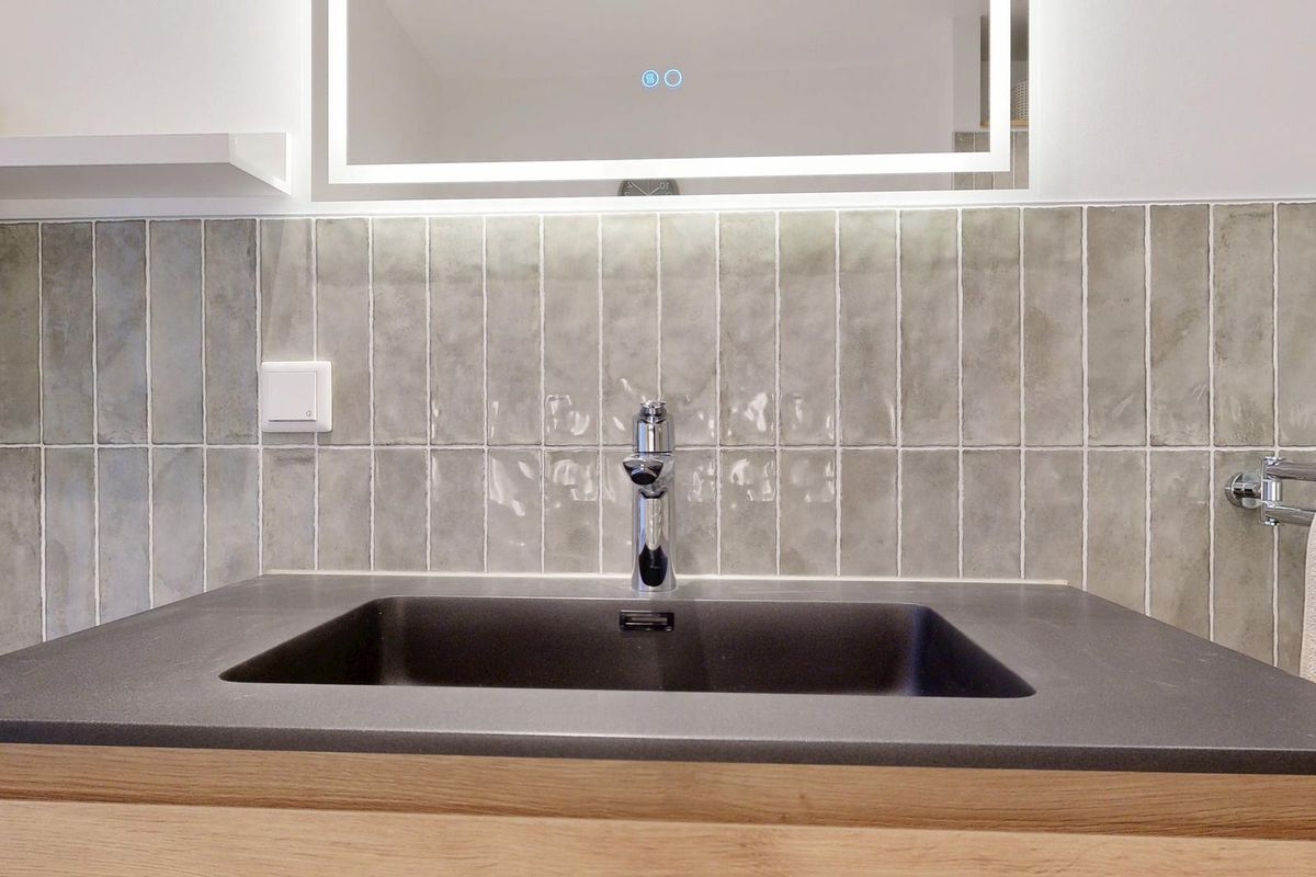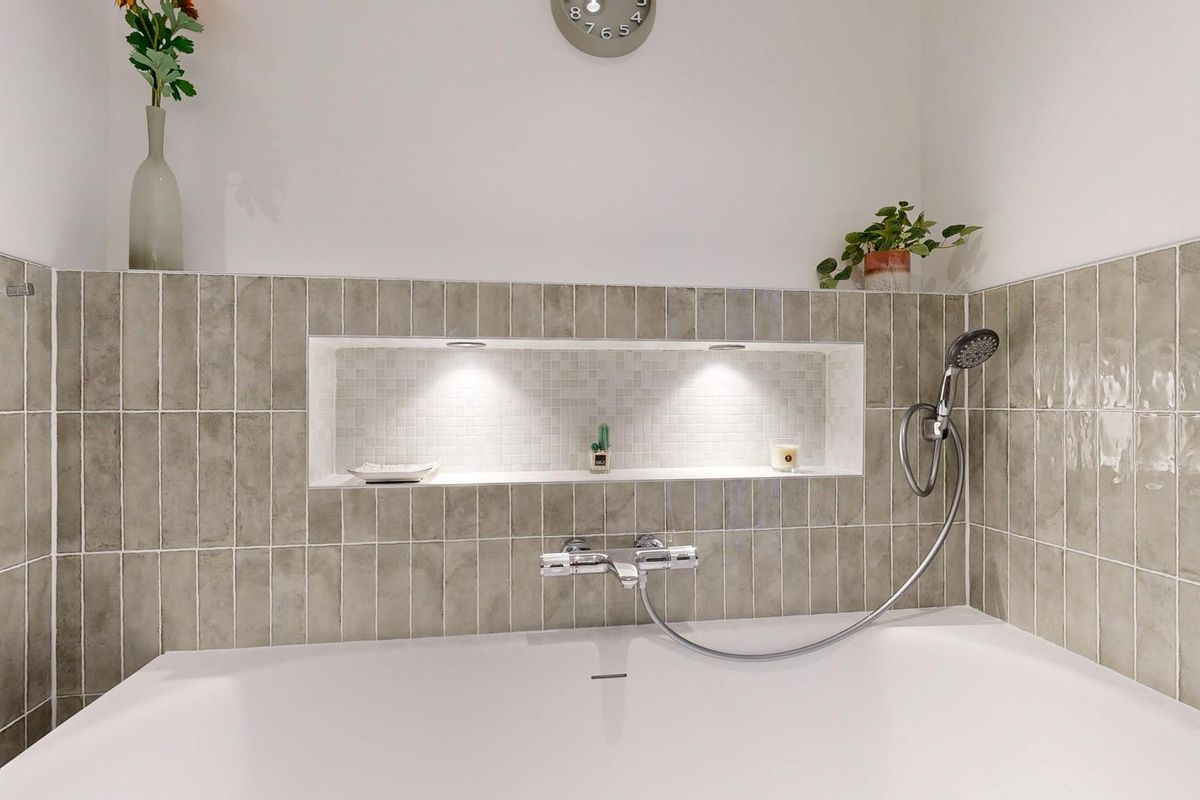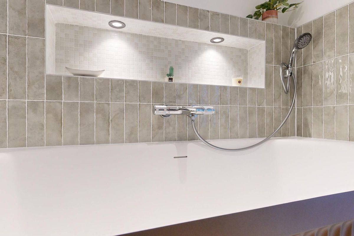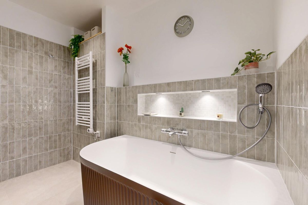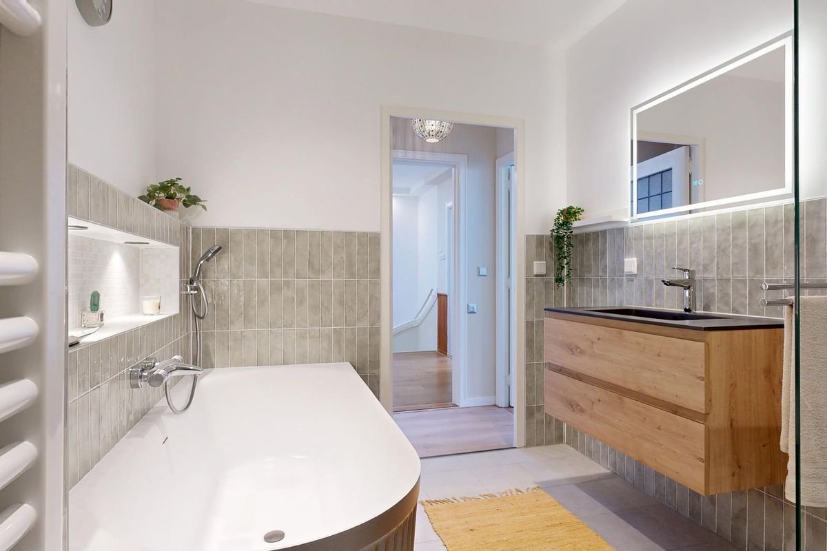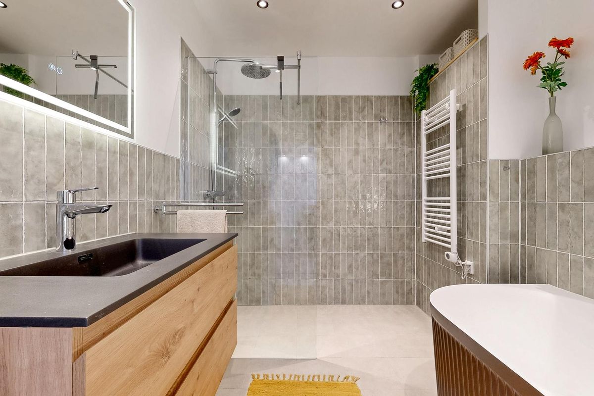 De tweede badkamer (2025) ademt luxe en wellness, met een ligbad, ruime inloopdouche en een stijlvol houten wastafelmeubel met verwarmde spiegel.