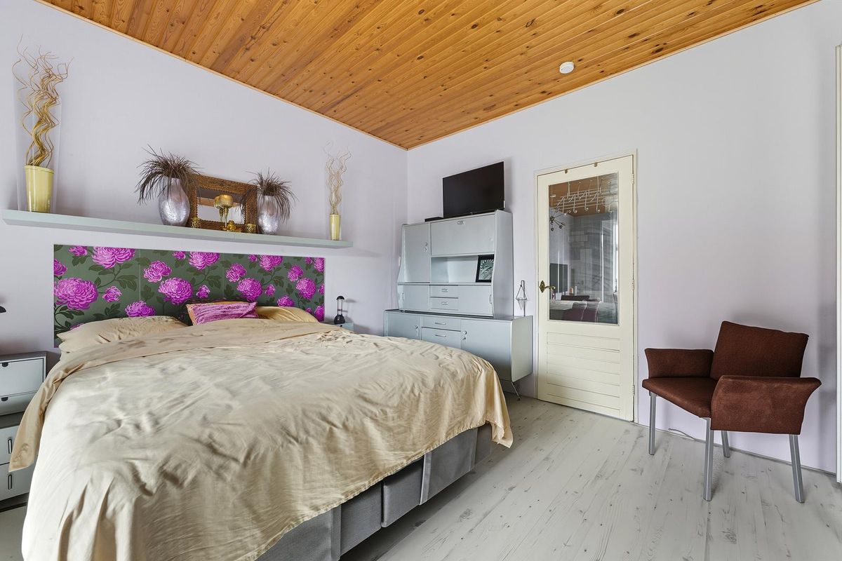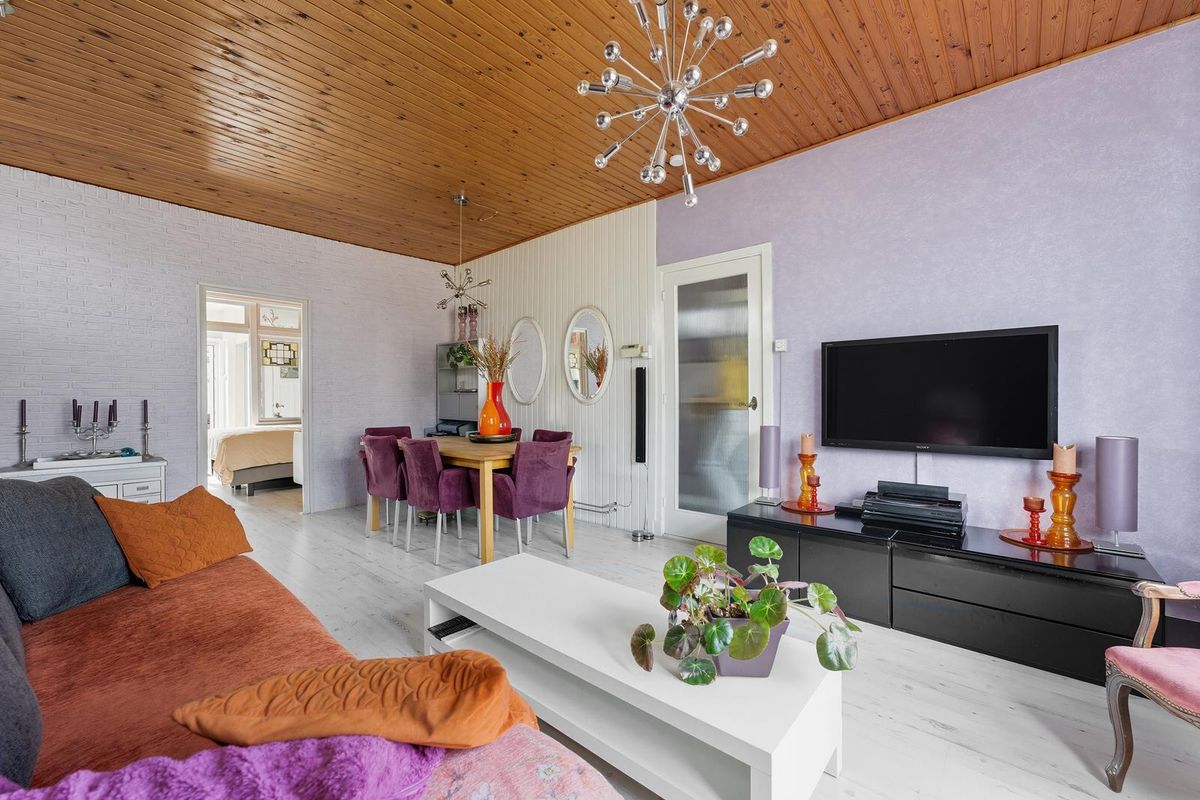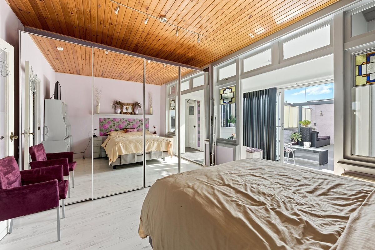 De woonkamer is opvallend ruim en licht, mede dankzij de erker aan de voorzijde en een extra zijraam. Hier is genoeg plek voor zowel een comfortabele zithoek als een royale eethoek. Alle kozijnen zijn uitgevoerd in onderhoudsvriendelijk kunststof met dubbel glas (energielabel D). Vanuit de woonkamer stap je de slaapkamer in, eveneens ruim bemeten en met plek voor een groot bed en kledingkast. Aansluitend bevindt zich een serre die toegang biedt tot het dakterras. Hier vind je ook een handige bergkast met opstelplaats voor de wasmachine, waar vroeger een kleine badkamer was gesitueerd. Het dakterras is een echte eyecatcher: ca. 39 m² groot, gelegen op het zuidoosten, voorzien van een gecoate vloer en achterin een fijne overkapping. Een ideale plek om te ontspannen, te dineren of vrienden te ontvangen.