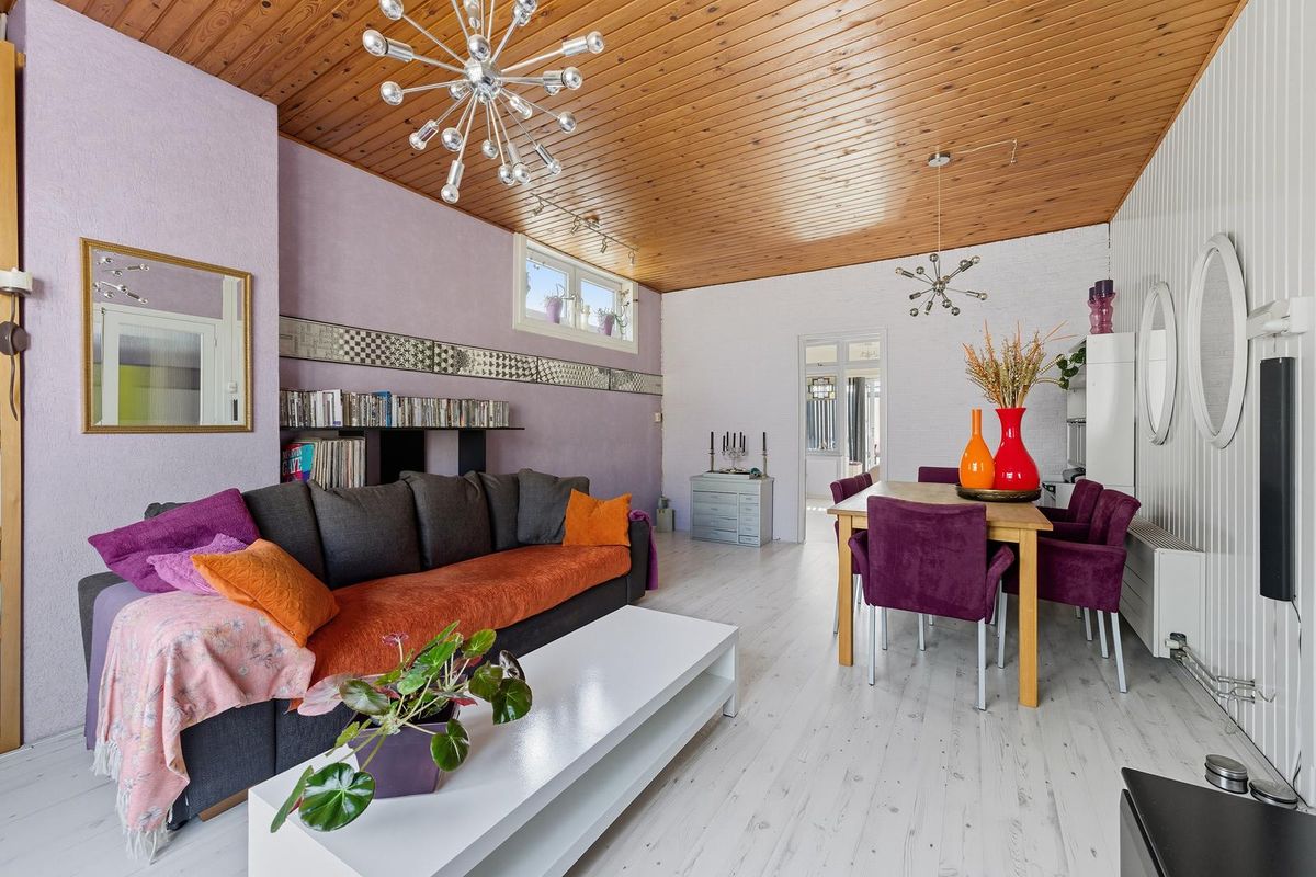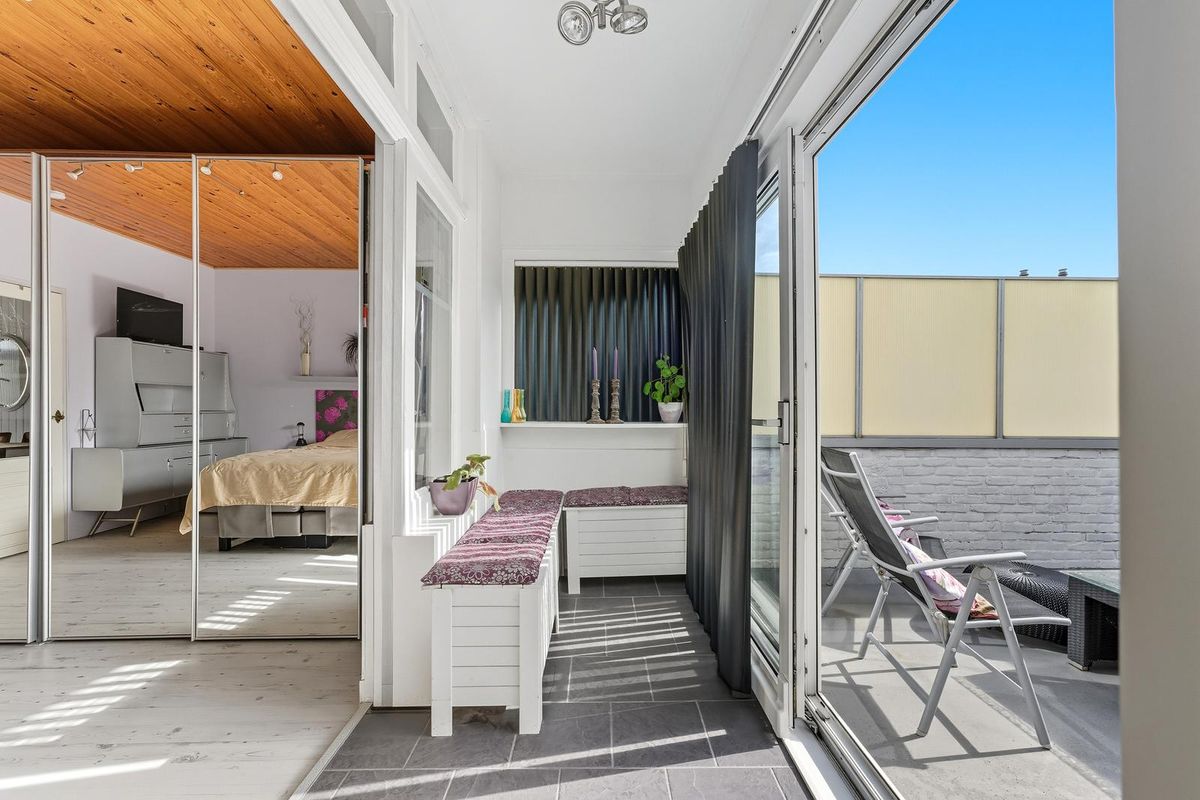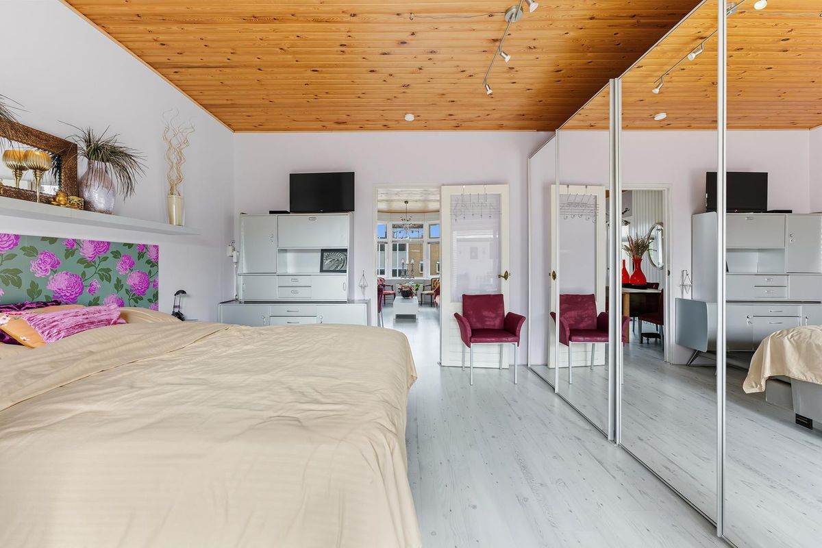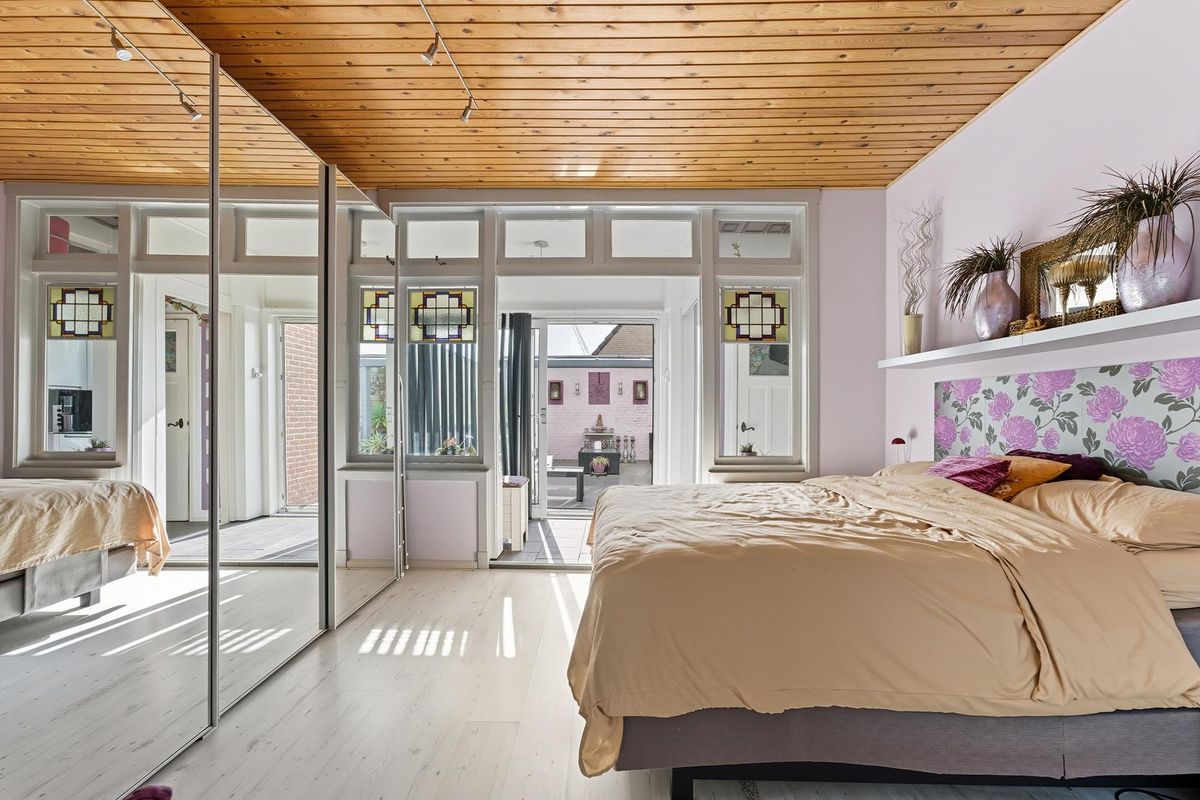 De woonkamer is opvallend ruim en licht, mede dankzij de erker aan de voorzijde en een extra zijraam. Hier is genoeg plek voor zowel een comfortabele zithoek als een royale eethoek. Alle kozijnen zijn uitgevoerd in onderhoudsvriendelijk kunststof met dubbel glas (energielabel D). Vanuit de woonkamer stap je de slaapkamer in, eveneens ruim bemeten en met plek voor een groot bed en kledingkast. Aansluitend bevindt zich een serre die toegang biedt tot het dakterras. Hier vind je ook een handige bergkast met opstelplaats voor de wasmachine, waar vroeger een kleine badkamer was gesitueerd. Het dakterras is een echte eyecatcher: ca. 39 m² groot, gelegen op het zuidoosten, voorzien van een gecoate vloer en achterin een fijne overkapping. Een ideale plek om te ontspannen, te dineren of vrienden te ontvangen.
