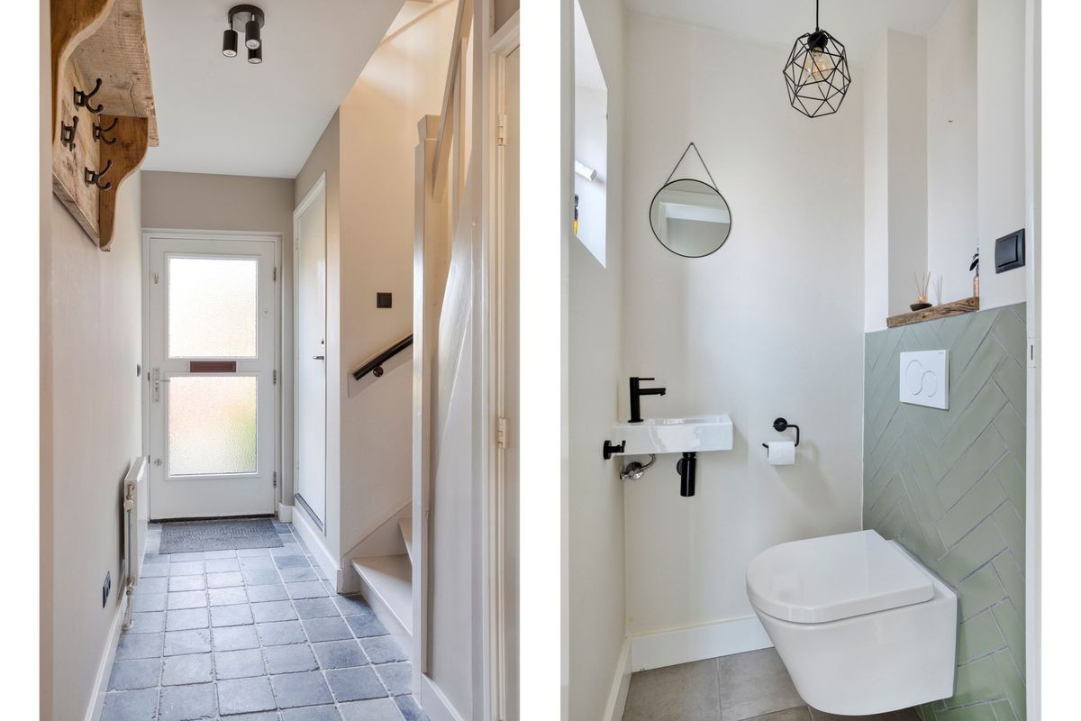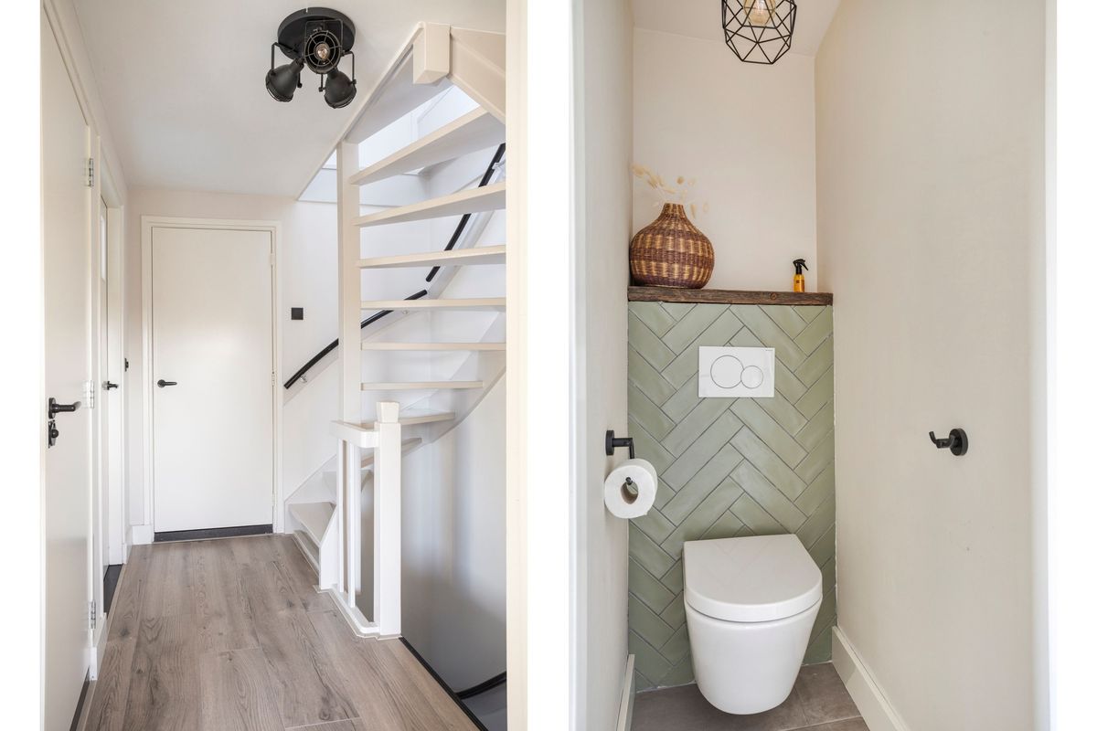Via de hal met trapopgang, toegang tot de kelder en een modern zwevend toilet met fonteintje stap je binnen in deze sfeervolle woning. De woonkamer is aan de voorzijde ingericht als zitgedeelte, terwijl je aan de achterzijde een royale eetruimte vindt dankzij de uitbouw. De centraal gelegen open keuken is uitgerust met een nette inbouwkeuken voorzien van diverse apparatuur. Aansluitend ligt de bijkeuken met inbouwkast en aansluitingen voor het witgoed. In de aanbouw naast de woning zijn een berging en een praktijkruimte gerealiseerd. De berging is vanuit de tuin bereikbaar, terwijl de praktijkruimte een eigen entree aan de voorzijde heeft. Hier zijn al voorbereidingen getroffen voor een toiletruimte, ideaal voor bijvoorbeeld een kapsalon of andere werkruimte aan huis.