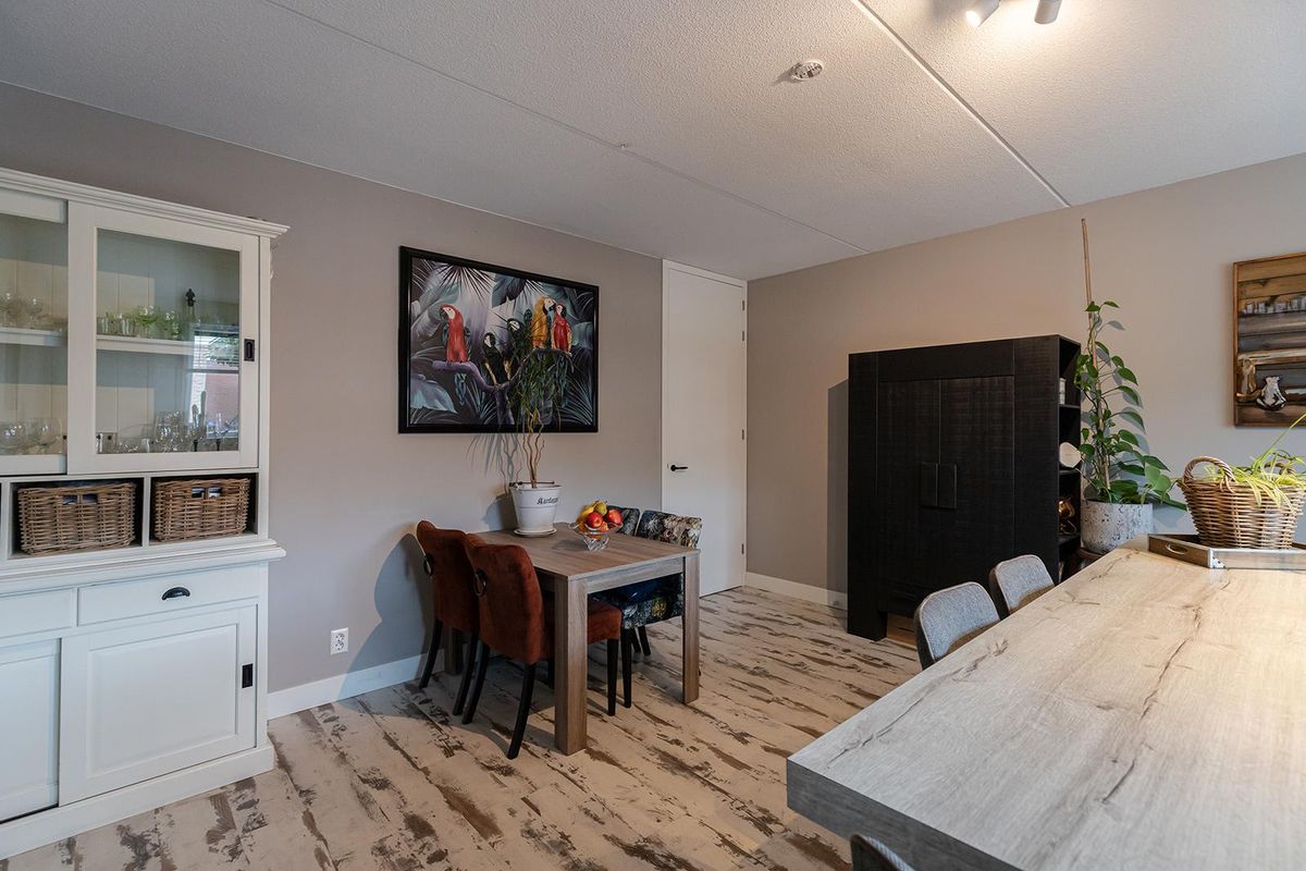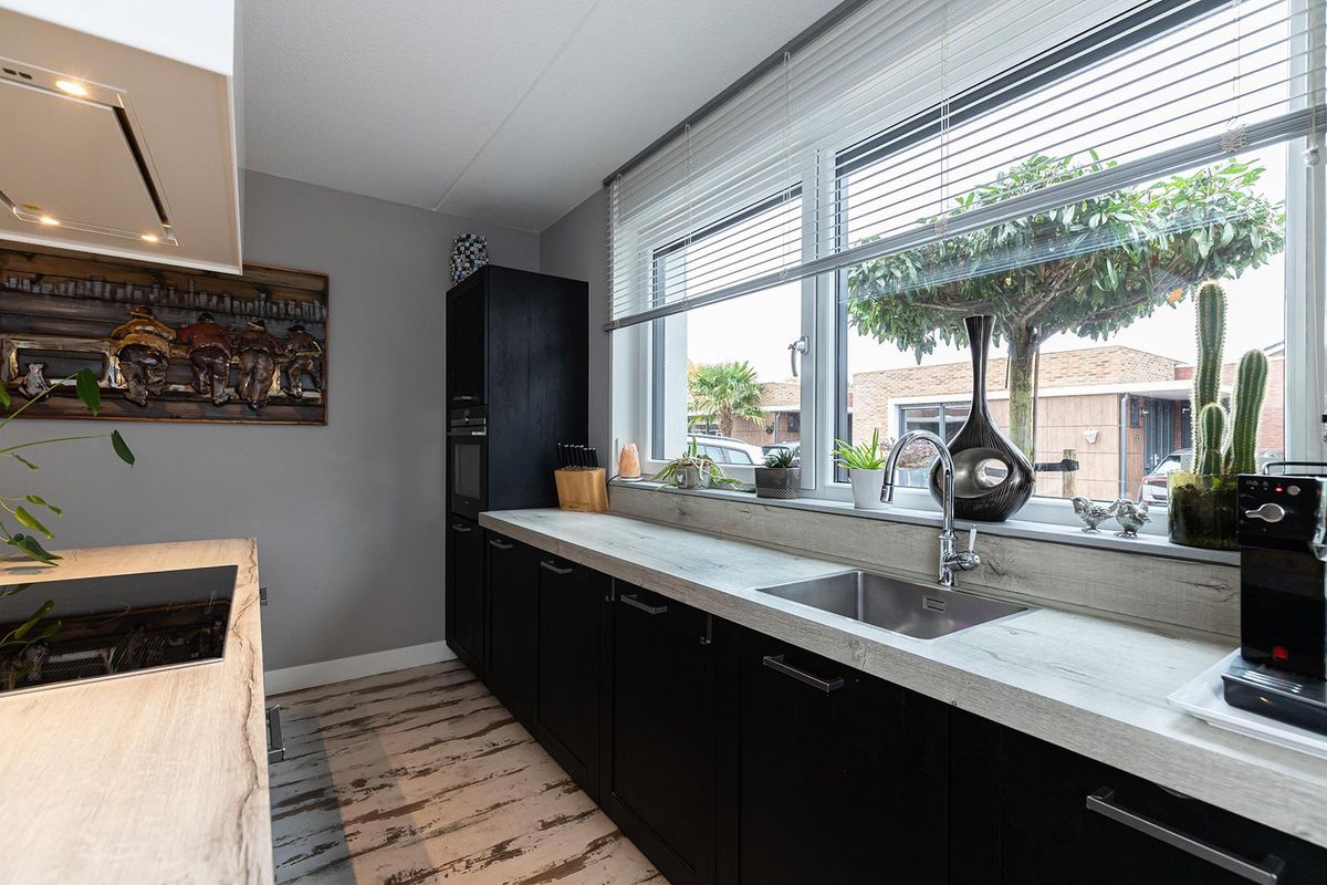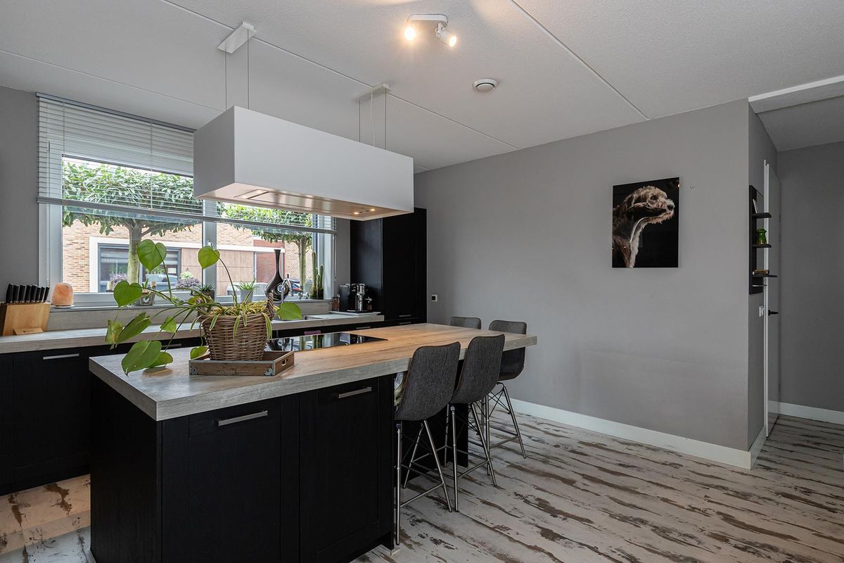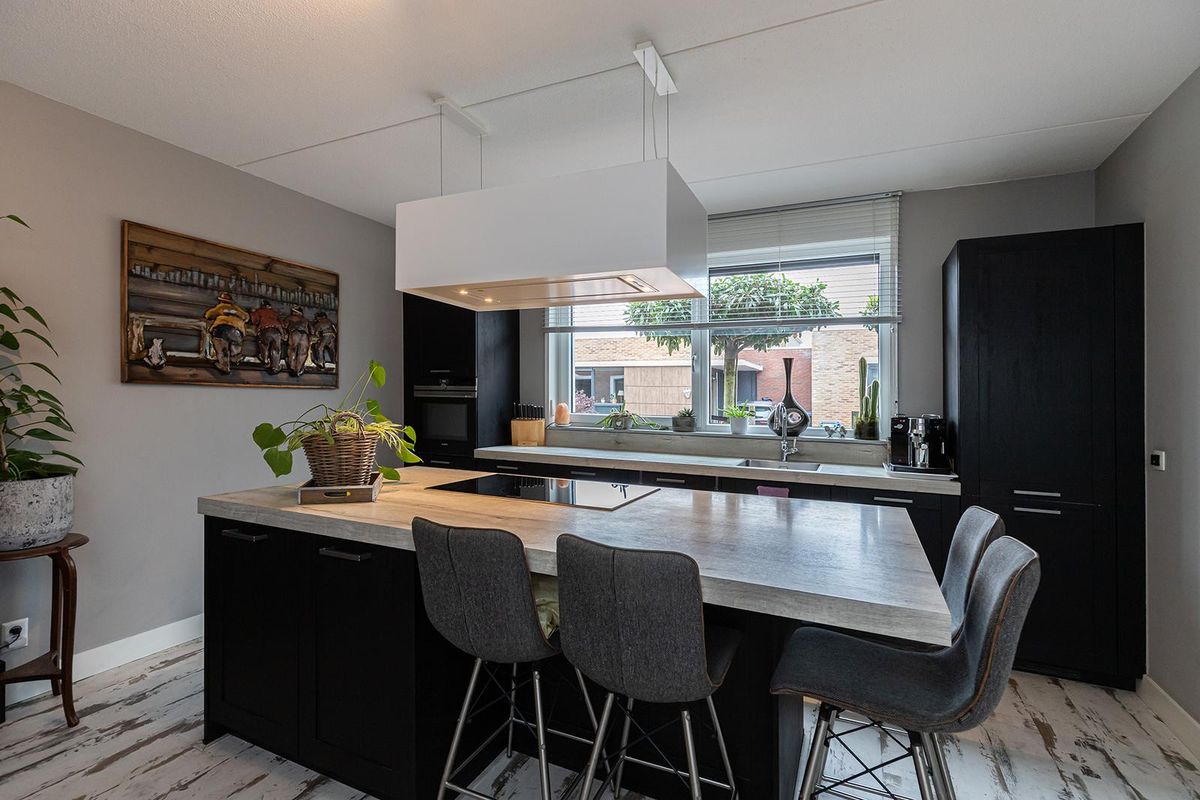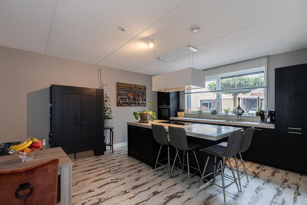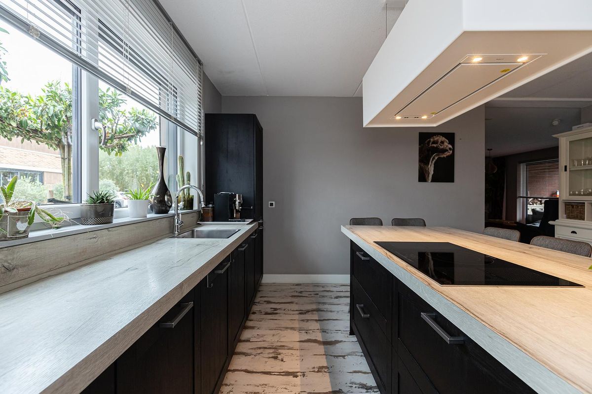 Vanuit de woonkamer loopt u moeiteloos naar de woonkeuken. En wat voor keuken: een groot kookeiland met zitmogelijkheid, uitgevoerd met stijlvolle donkere kastjes en een grijzig eikenkleurig gehard multiplex werkblad. Uiteraard voorzien van inductiekookplaat, combi-oven/magnetron, vaatwasser, koelkast en vriezer – een plek waar koken, samen zijn en ontspannen elkaar ontmoeten.