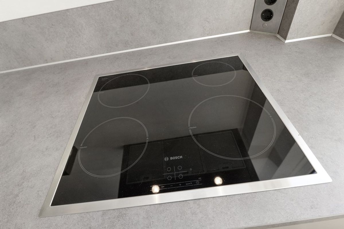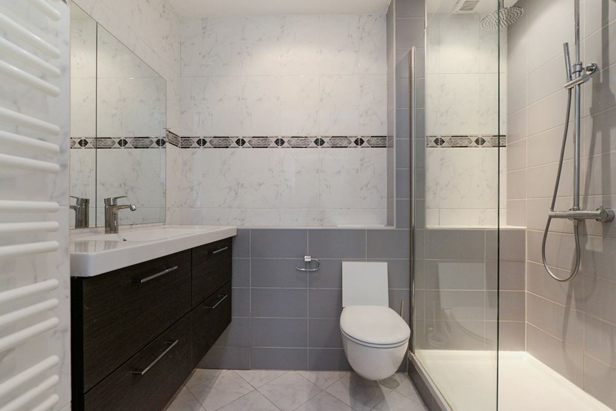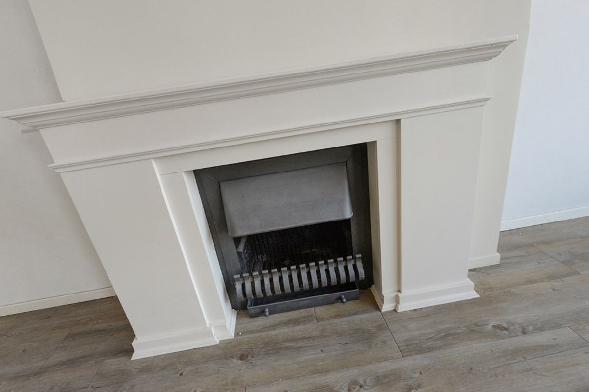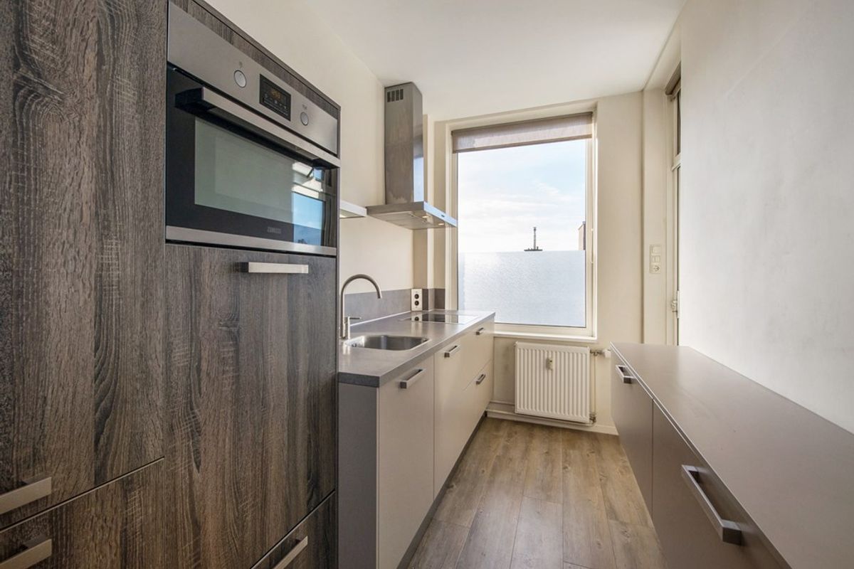 Apartment entrance, spacious hall with door to the L-shaped living-dining room with fireplace / fireplace, three fitted wardrobes and a door to a small front balcony. Almost the entire apartment has a beautiful PVC floor. The spacious rear bedroom has laminate flooring, three fitted wardrobes and a door to a very sunny South West balcony with a fixed cupboard and electricity. The rear side room has a cupboard wall with washing machine and dryer connection. The bathroom has a large walk-in shower, washbasin, floating toilet, hand basin and a design radiator. The whole is done in light tones. The kitchen is equipped with a modern luxury fridge-freezer combination, a dishwasher, a new combi microwave, induction hob and an extra wide plastic counter top with drawers and cupboards. Adjacent the door to the balcony with electrically operated awning.