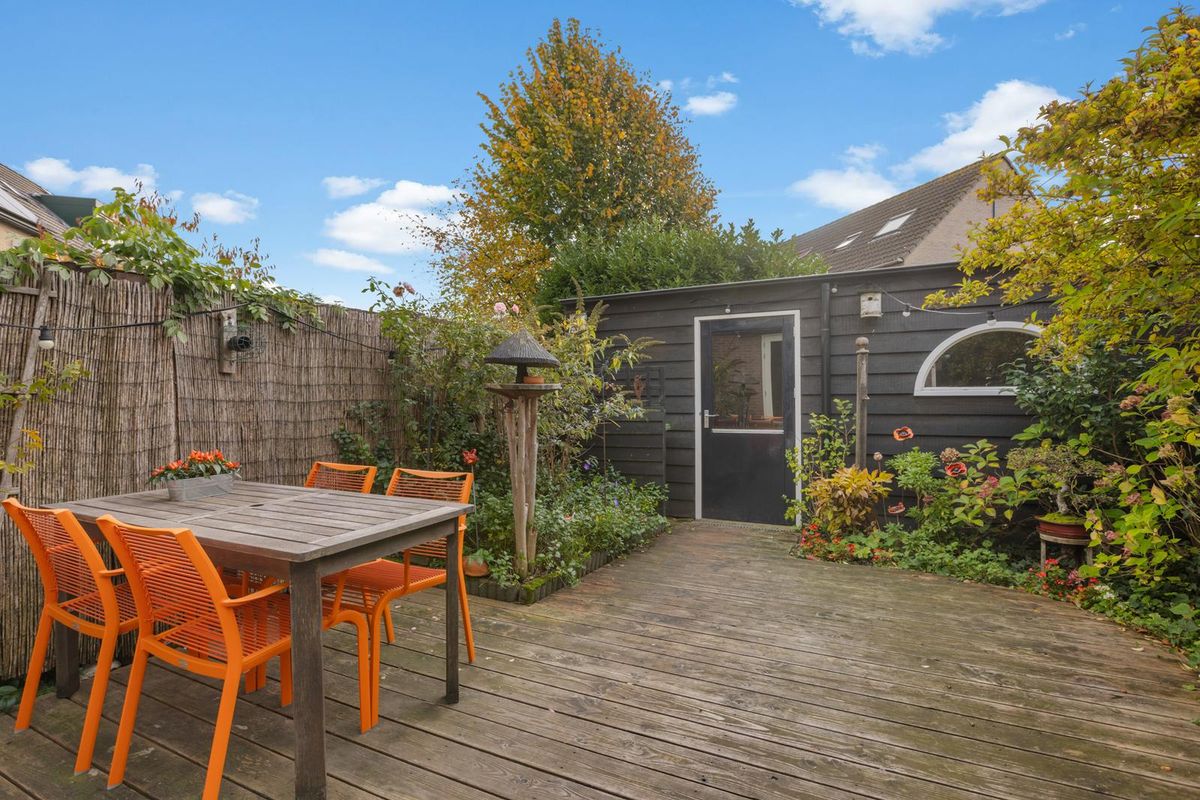 De openslaande deuren aan de achterzijde brengen je naar de tuin: een sfeervolle buitenruimte met een houten vlonder en een groene, verzorgde indeling. Hier geniet je in alle rust van het buitenleven – op het terras, omringd door privacy en groen. Achter in de tuin bevindt zich een ruime schuur, momenteel ingericht als praktische hobby- en klusruimte, maar ook ideaal voor het stallen van fietsen, een motor of tuingereedschap. Dankzij de handige roldeur heb je bovendien directe toegang tot de achterom. Parkeren kan eenvoudig aan de voorzijde van de woning, waar volop ruimte beschikbaar is.