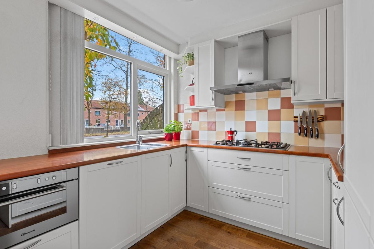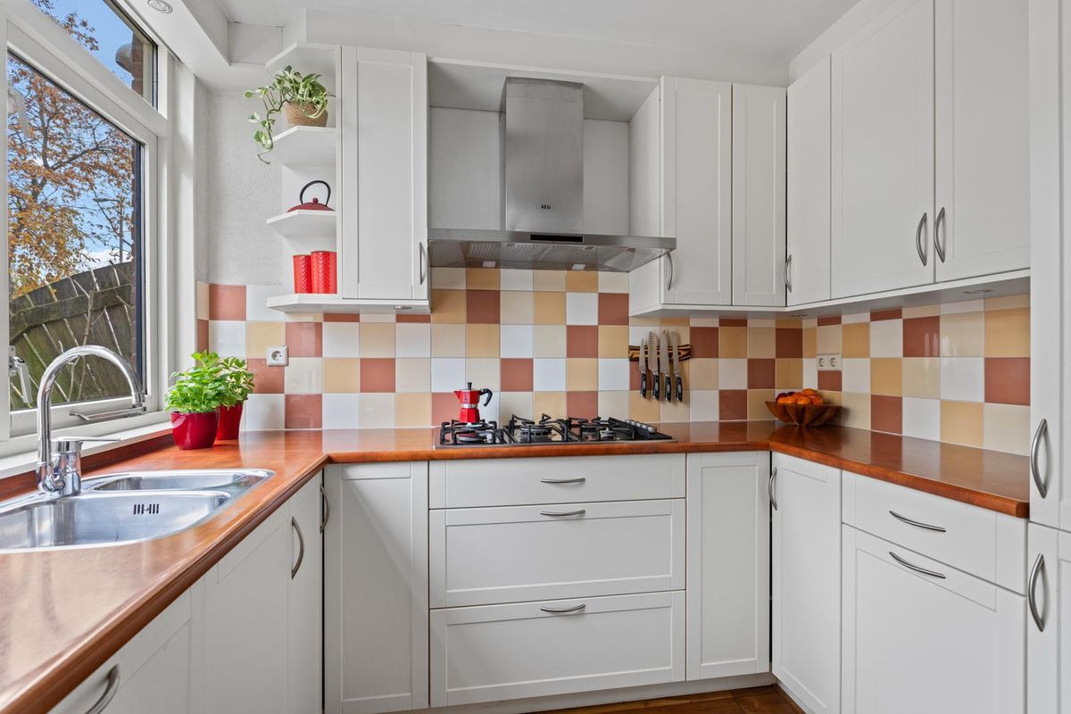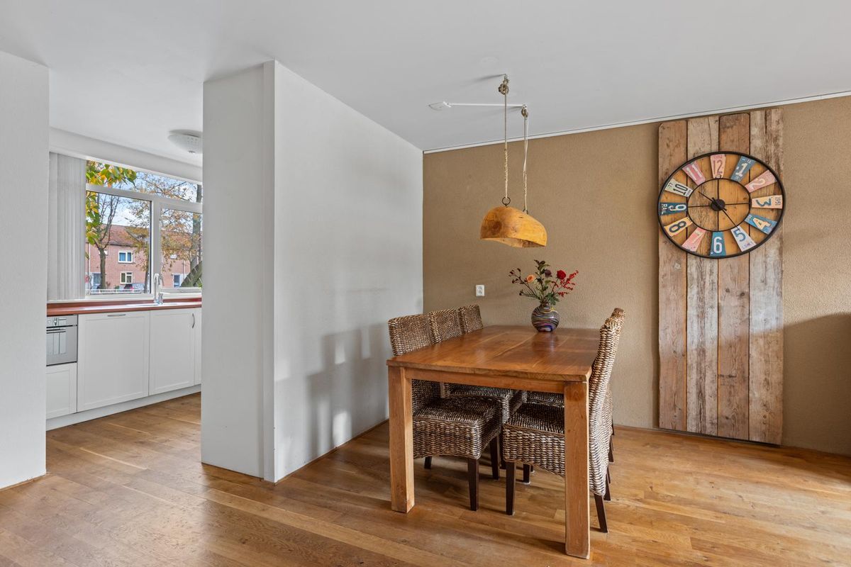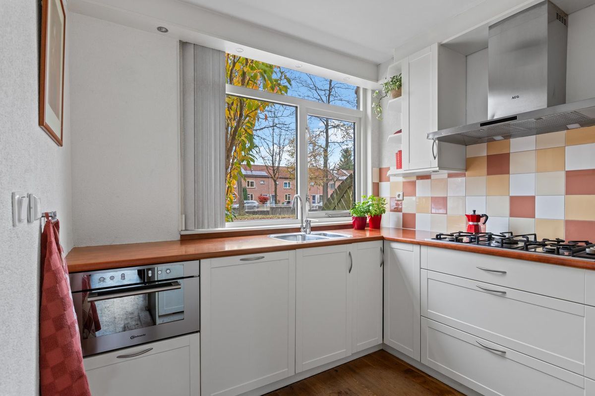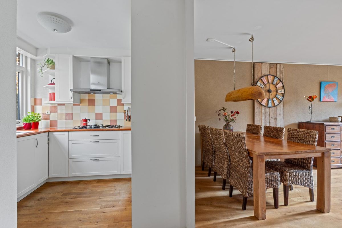 Halverwege de woonkamer vind je het eetgedeelte, perfect gesitueerd tussen de zitkamer en de keuken. De halfopen keuken aan de voorzijde is praktisch ingedeeld en voorzien van inbouwapparatuur zoals een gaskookplaat met afzuigkap, vaatwasser, koel-/vriescombinatie en combioven. Terwijl je kookt, kijk je via het keukenraam uit over de singel – een heerlijk uitzicht dat nooit verveelt. Vanuit de hal bereik je de eerste verdieping.