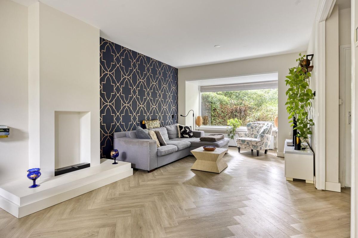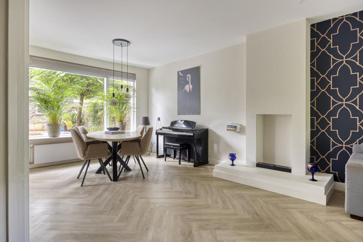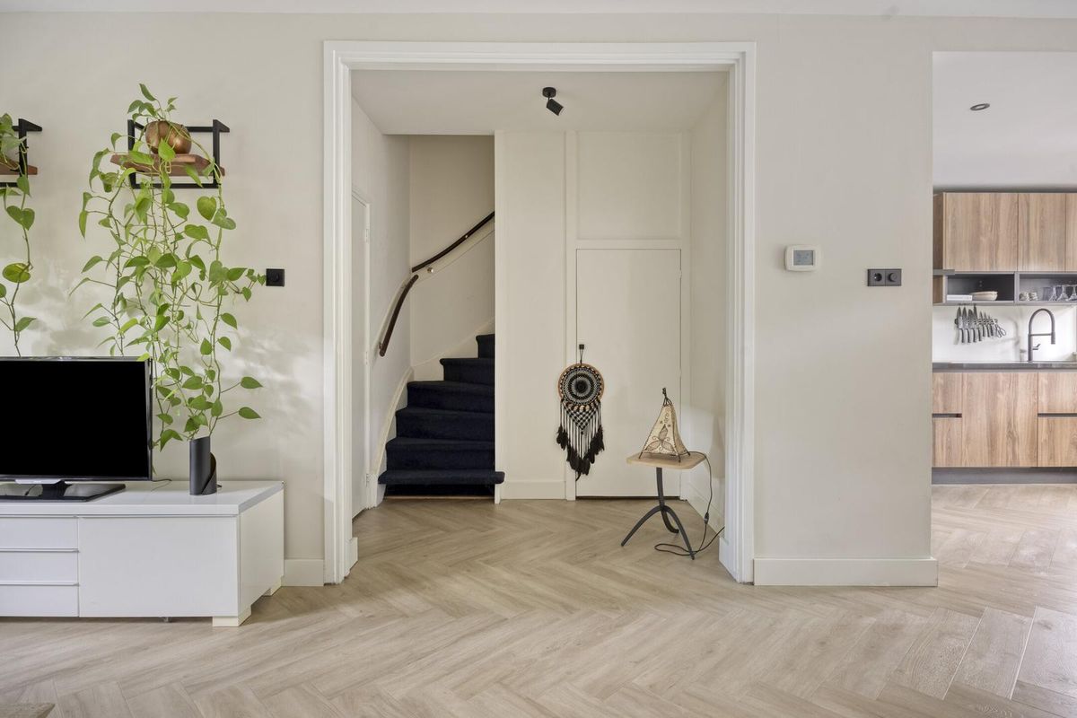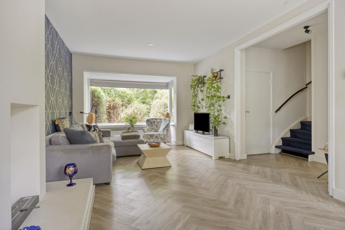De lichte woonkamer is een heerlijke leefruimte met grote ramen aan zowel de voor- als achterzijde en een charmante erker die zorgt voor extra lichtinval. De wanden en plafonds zijn strak gestuukt en op de vloer ligt een fraaie visgraat PVC-vloer (2022). Onder de trap is een praktische trapkast aanwezig.