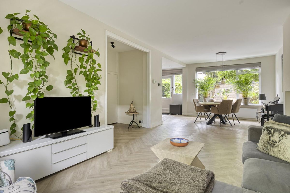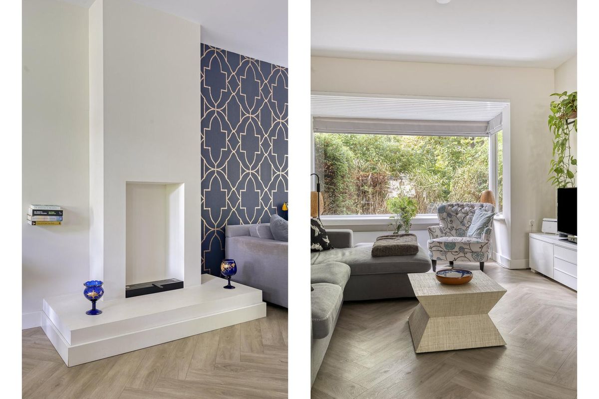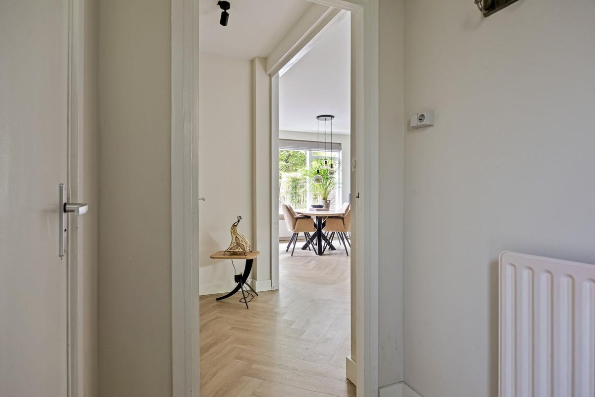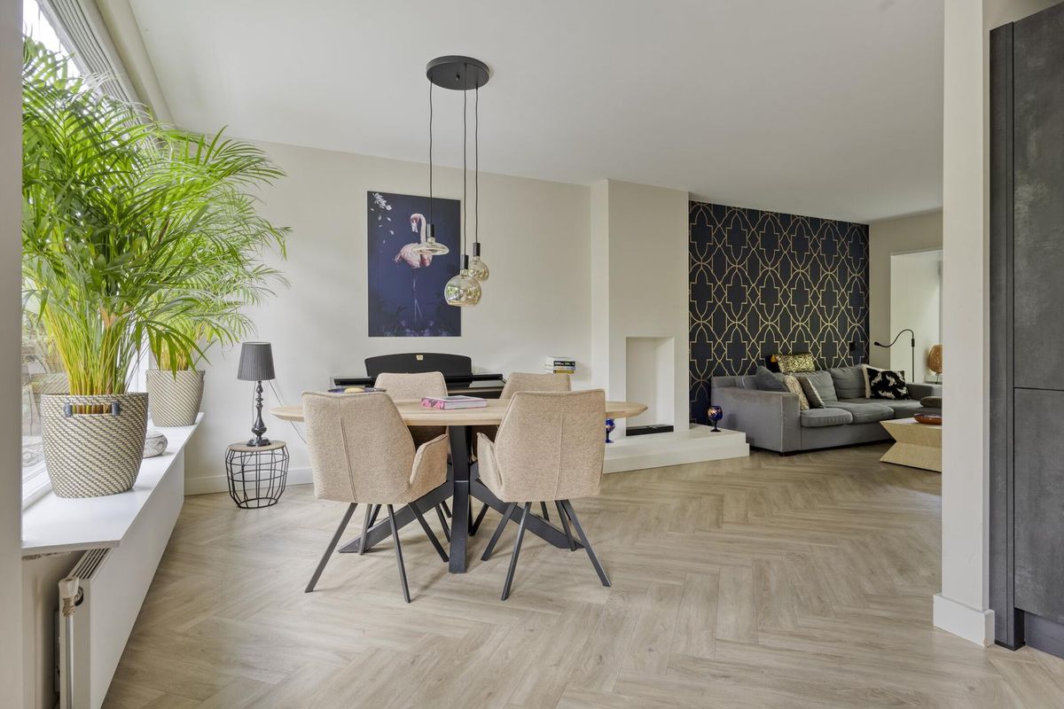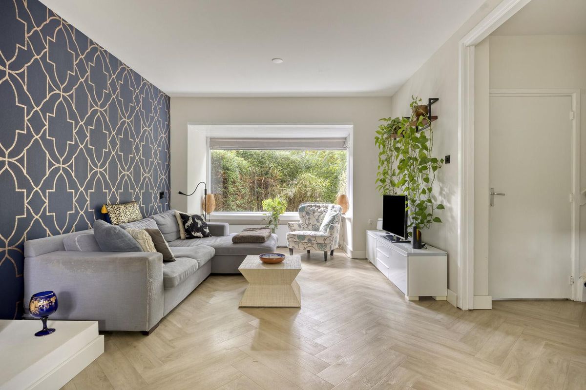 De lichte woonkamer is een heerlijke leefruimte met grote ramen aan zowel de voor- als achterzijde en een charmante erker die zorgt voor extra lichtinval. De wanden en plafonds zijn strak gestuukt en op de vloer ligt een fraaie visgraat PVC-vloer (2022). Onder de trap is een praktische trapkast aanwezig.