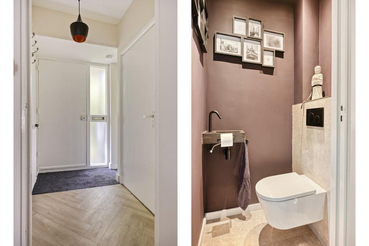 Via de verzorgde voortuin bereik je de entree met meterkast en modern toilet, uitgevoerd met een zwevend closet, antraciet fonteintje en stijlvol tegelwerk in lichtgrijs en strak stucwerk.