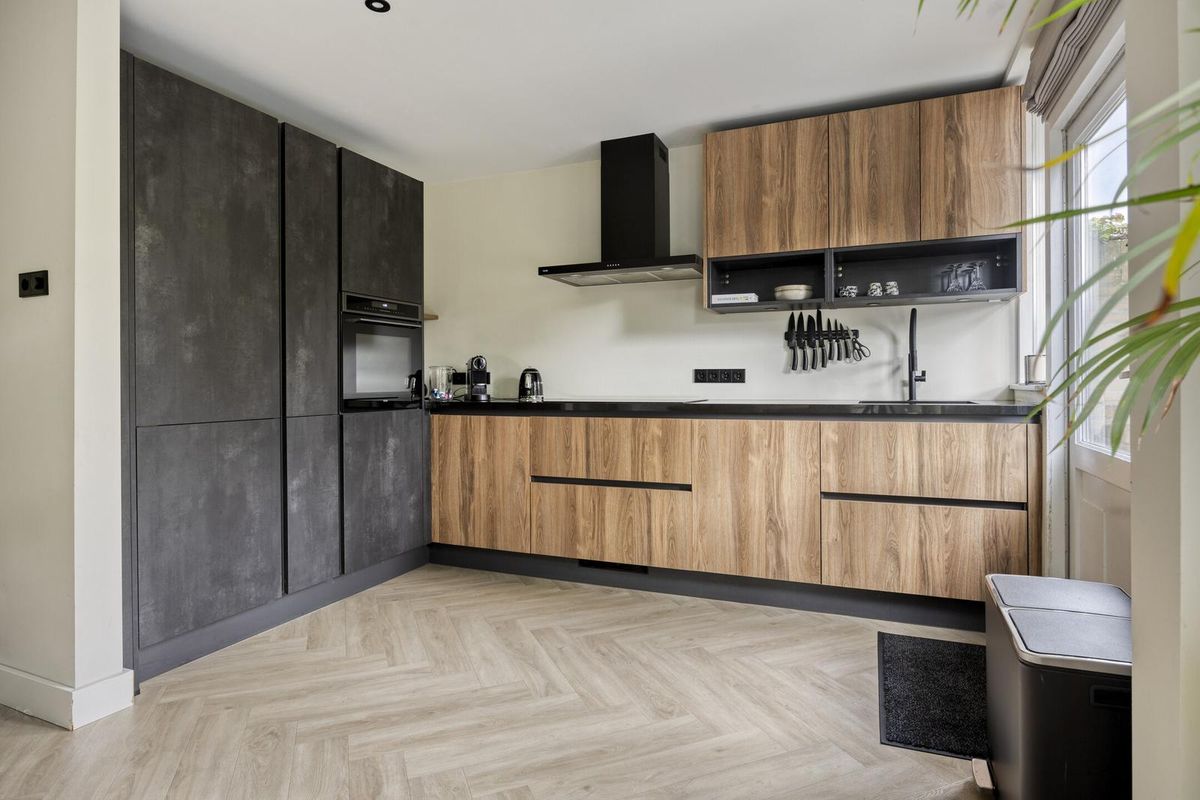 De open keuken (2022) in L-opstelling is een echte eyecatcher: een combinatie van houtlook en industriële betonlook, afgewerkt met een natuurstenen werkblad. De keuken is compleet uitgerust met een koelkast, vriezer, vaatwasser, combi-magnetron, inductiekookplaat met zwarte afzuigkap, zwarte spoelbak met bijpassende kraan en veel kastruimte. Sfeervolle dimbare spotjes maken het geheel af. Vanuit de keuken is er directe toegang tot de tuin.