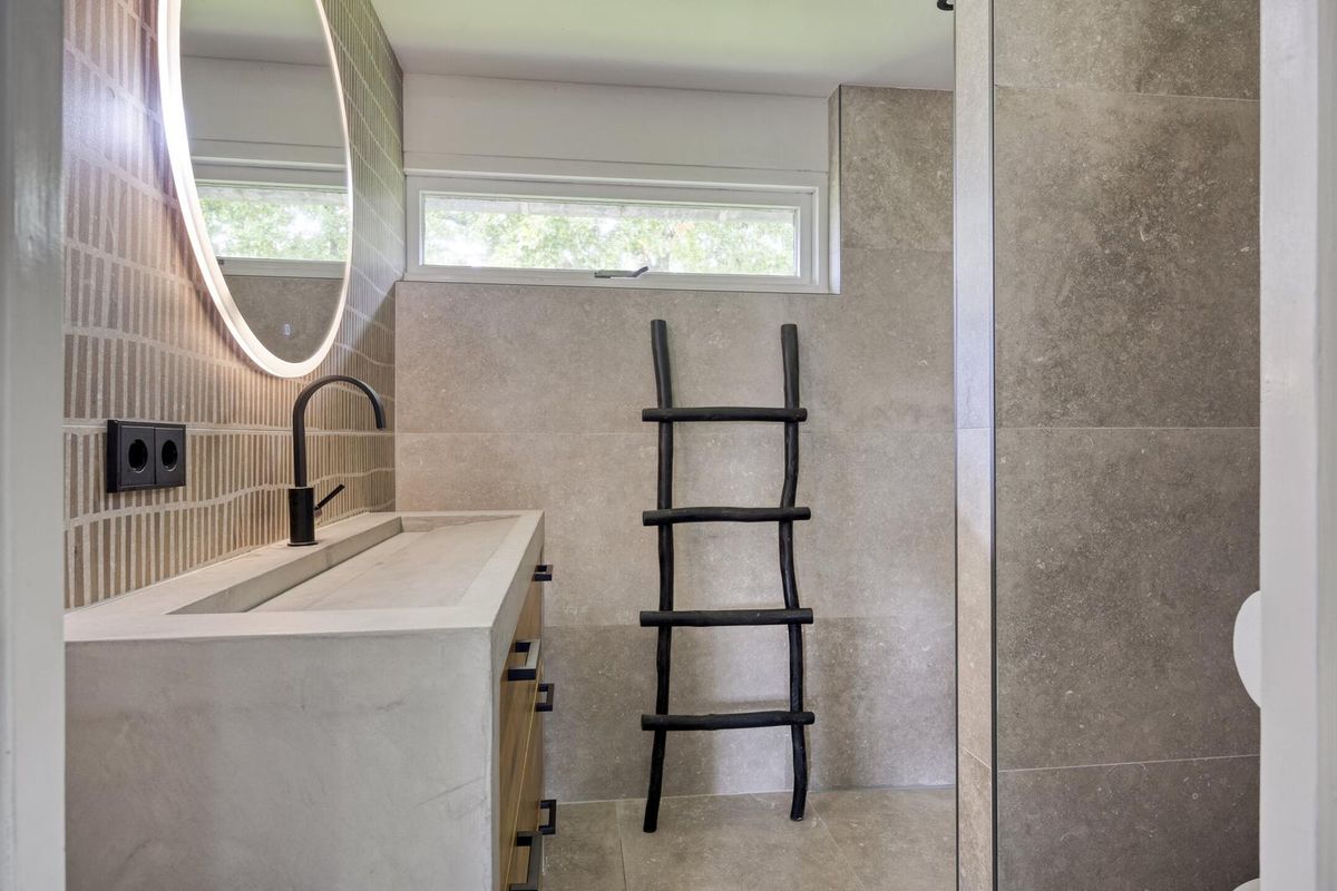 De badkamer (2022) is modern en luxe uitgevoerd: volledig betegeld, voorzien van een inloopdouche met regen- en handdouche, een tweede zwevend toilet, een breed wastafelmeubel en inbouwspotjes. Dankzij het raam geniet de ruimte van daglicht en natuurlijke ventilatie.