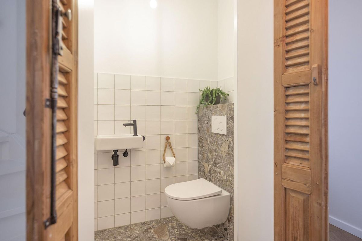 - Entree/hal met garderobe-nis, meterkast en modern toilet met wandcloset en fontein.