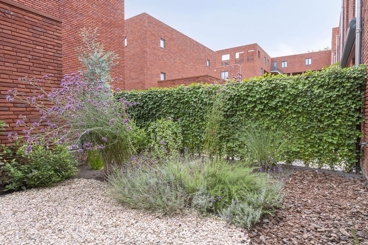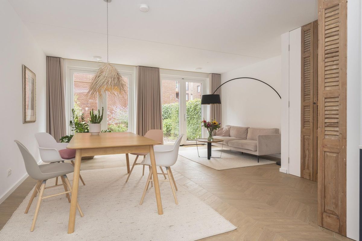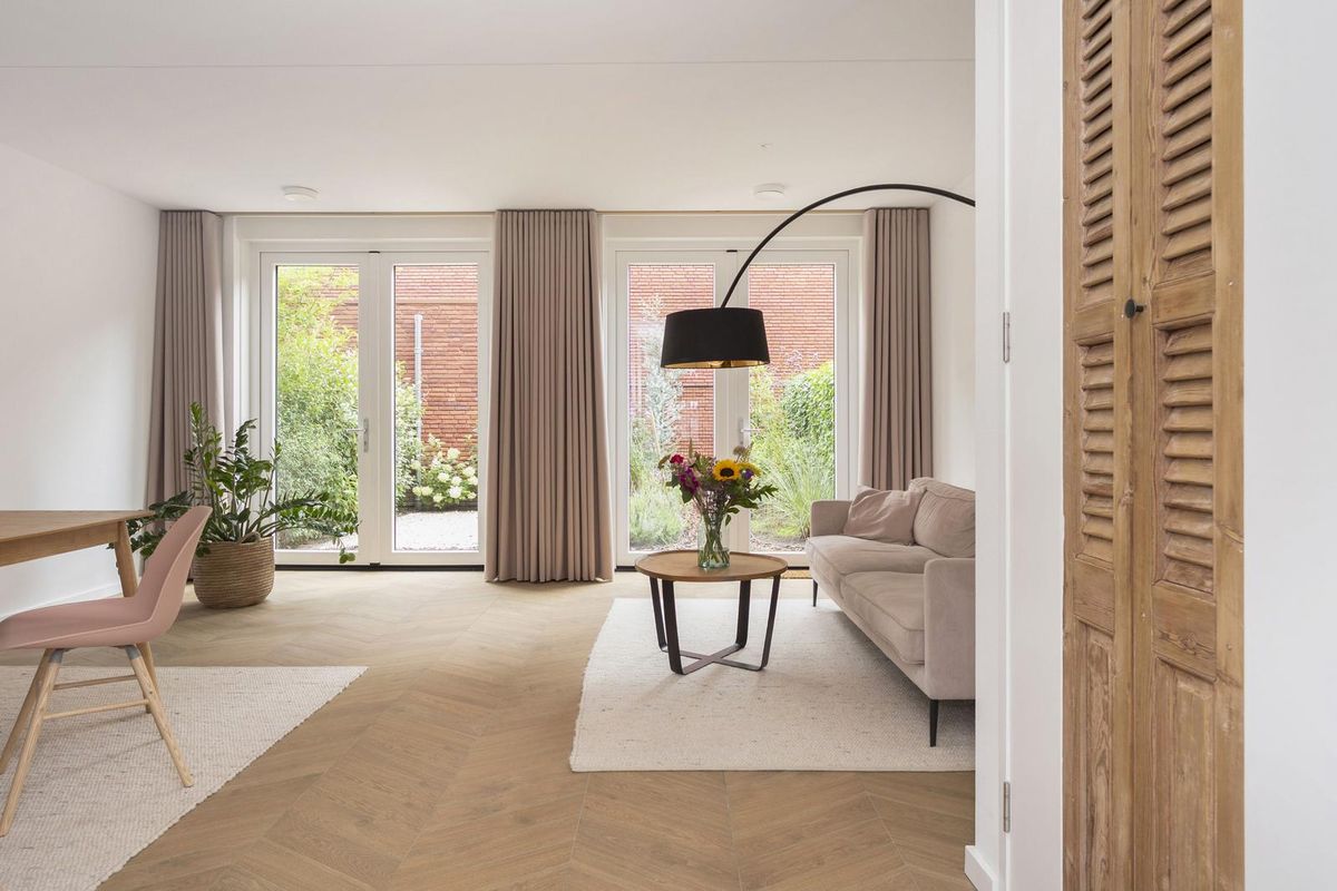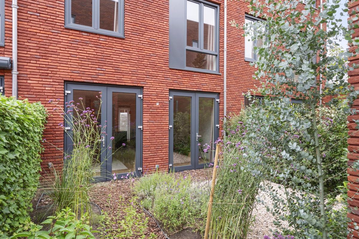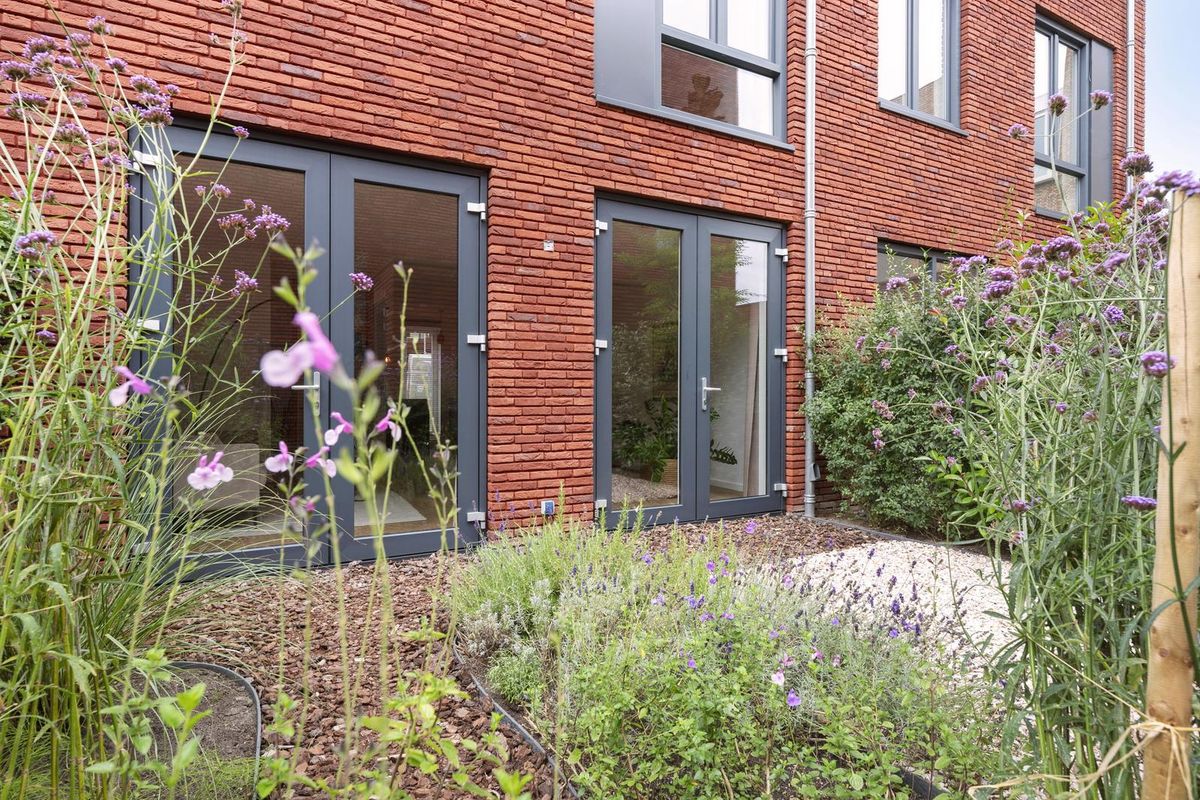 - Twee gevelkozijnen met openslaande tuindeuren verbinden binnen met buiten en geven fijn zicht op en contact met de aangelegde knusse stadstuin.