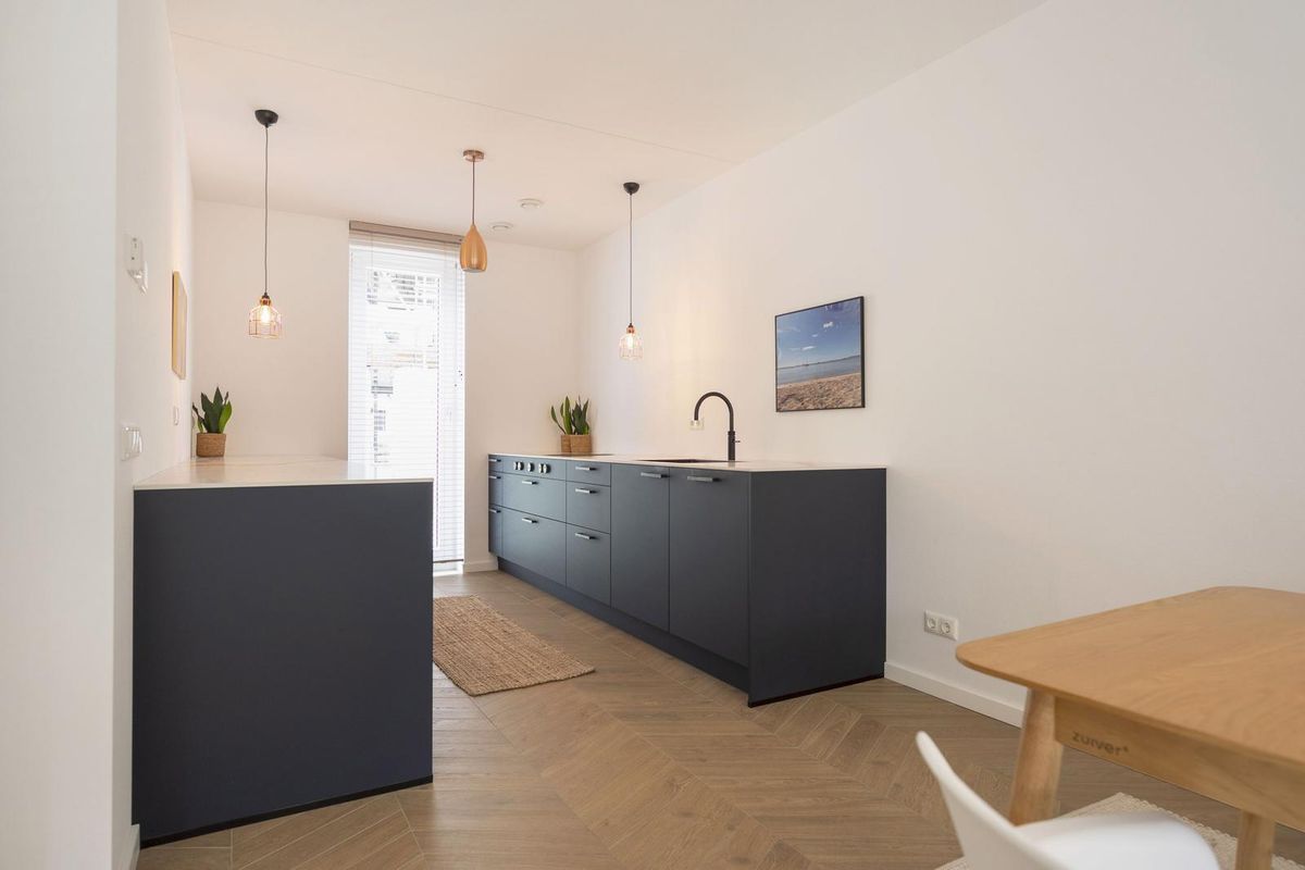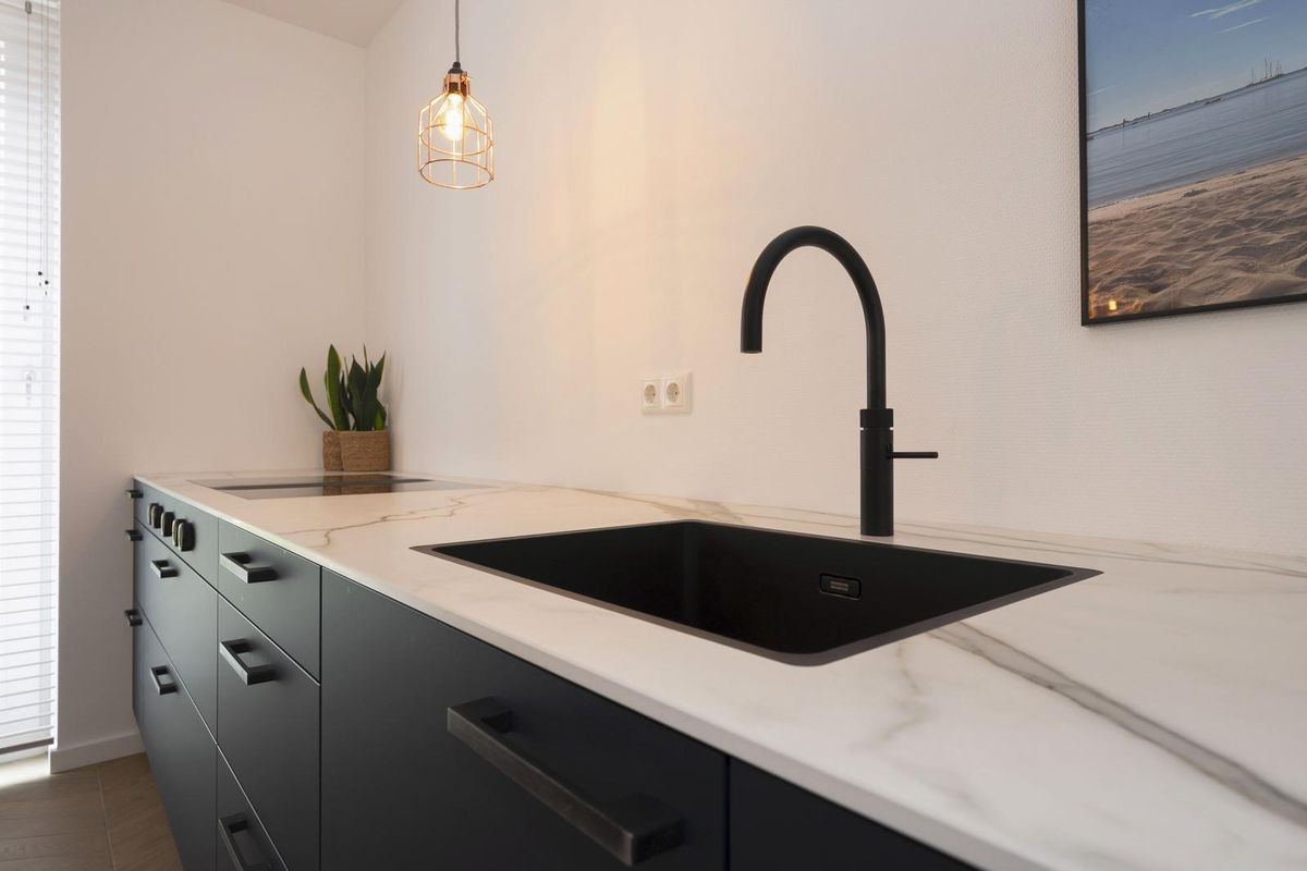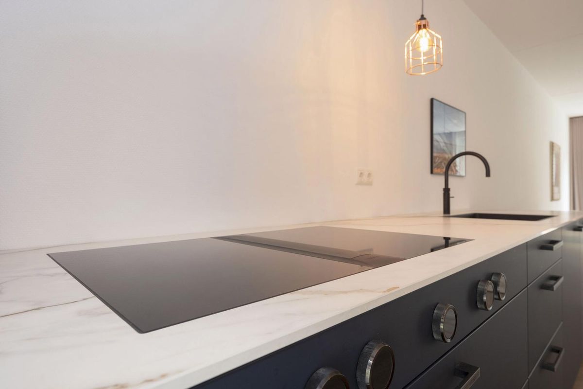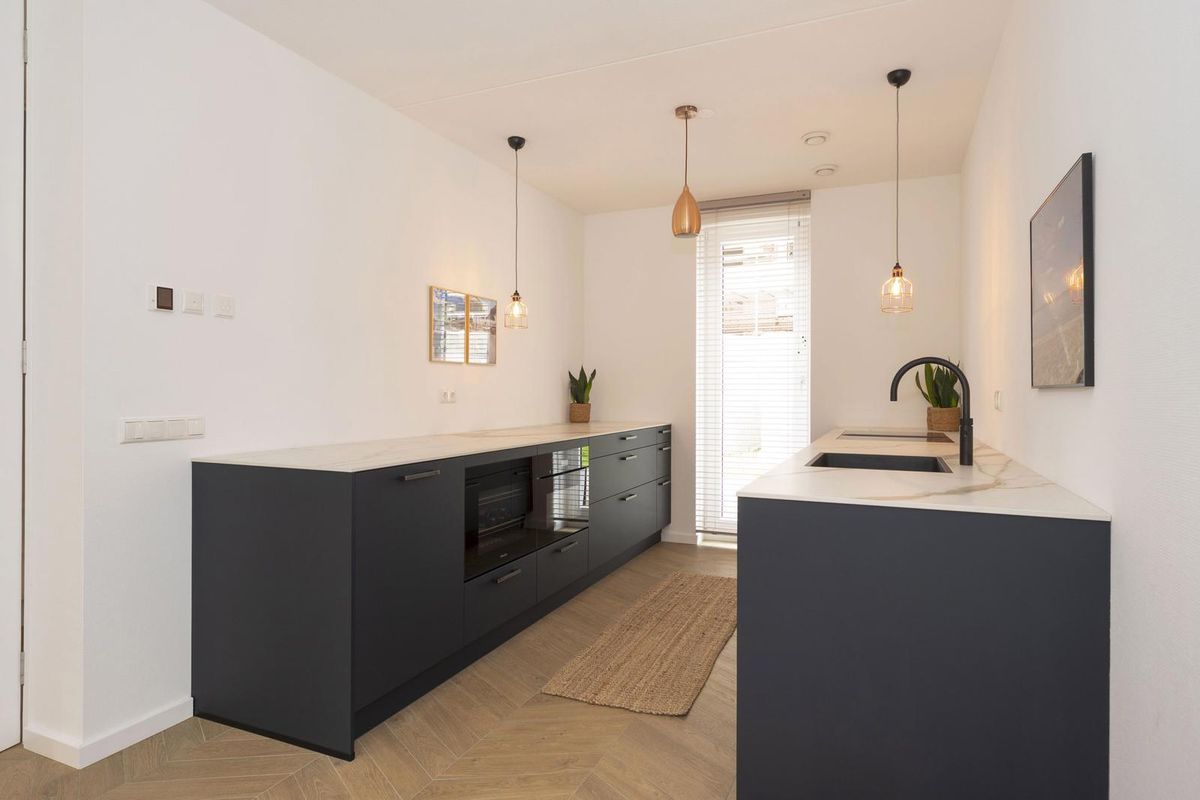 - De keukeninrichting is modern met 2 parallelle wandopstellingen met praktische indeling en luxe inbouwapparatuur, afgewerkt met composiet werkbladen.