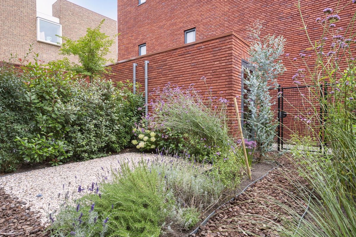 - De achtertuin, die op het zuiden is gelegen, is tevens via een afsluitbare achteringang bereikbaar via een mandelig pad.