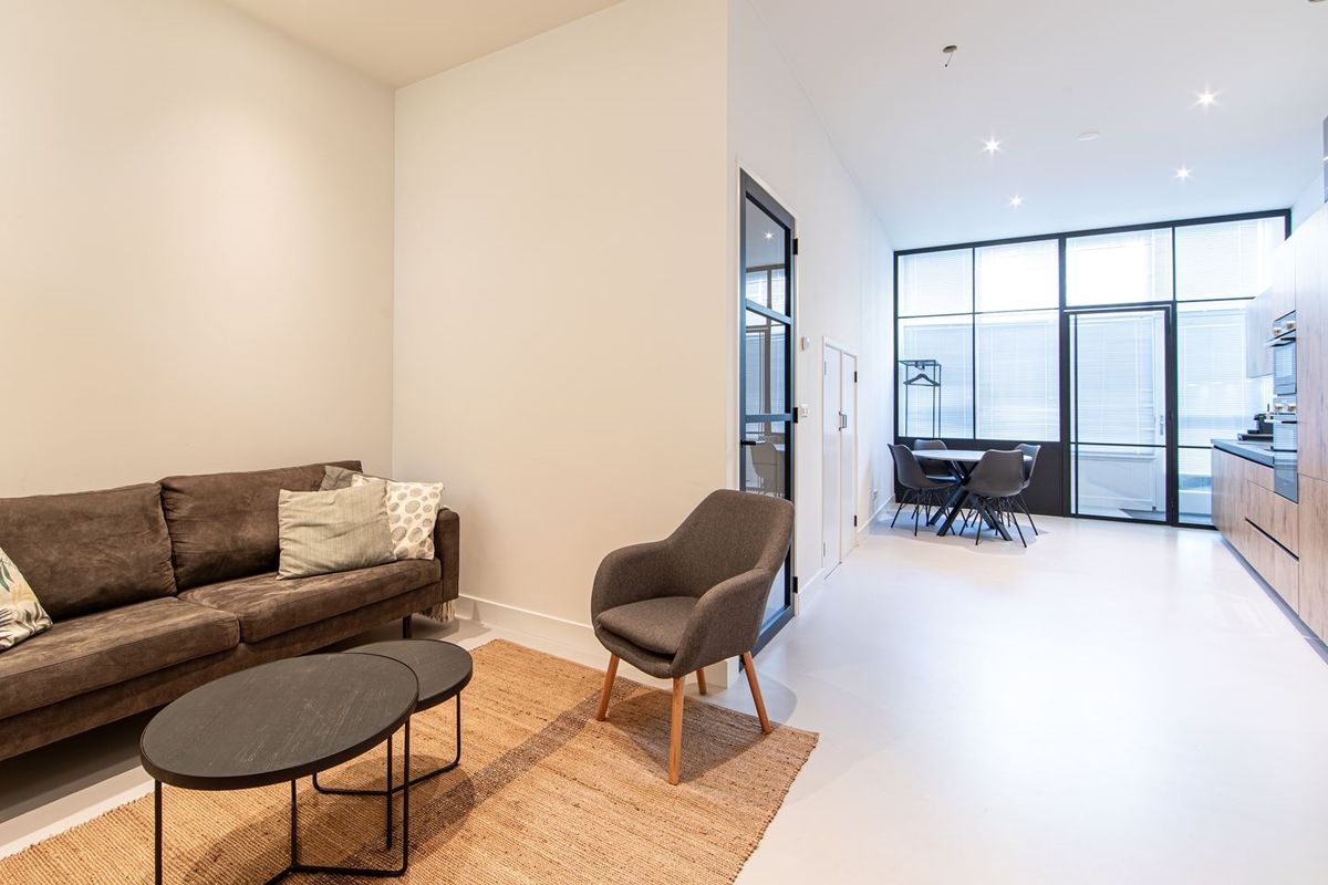 Aan de overkant van de keuken bevindt zich een praktische wasruimte met aansluitingen voor wasmachine en droger, evenals een keurige toiletruimte met wandcloset en fontein. De woonkamer, gelegen in het verlengde van de keuken, biedt voldoende ruimte voor een gezellige zithoek. De hele woning is afgewerkt met strak gestuukte wanden en een lichte gietvloer, voorzien van comfortabele vloerverwarming.