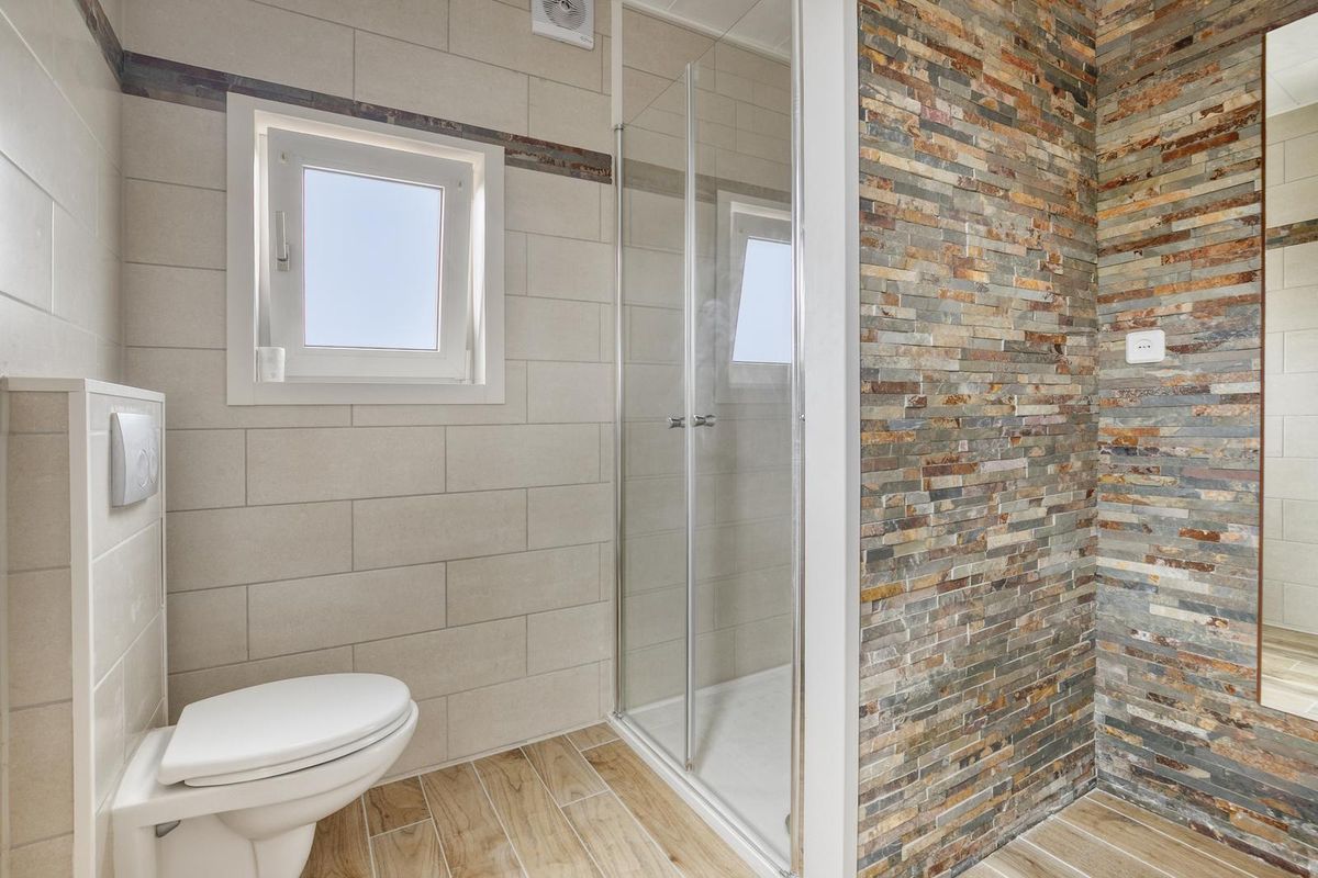 - Rondom voorzien van deels kunststof en deels houten kozijnen met gedeeltelijk dubbelglas en rolluiken