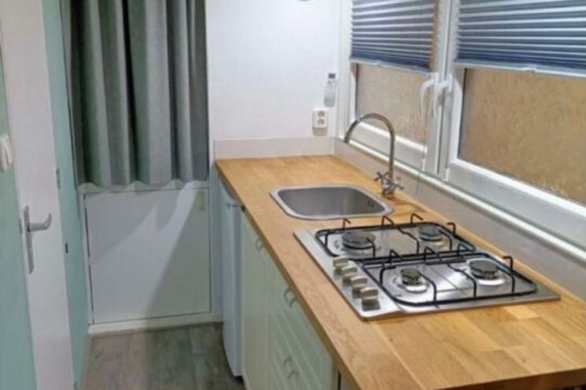 Binnenin het huisje vind je alles wat je nodig hebt voor een comfortabel verblijf. De knusse woonkamer is voorzien van een flatscreen tv, waarop je heerlijk kunt ontspannen na een lange dag. Het compacte keukenblok is uitgerust met een combi magnetron, kookplaat en koelkast, zodat je zelf je maaltijden kunt bereiden.