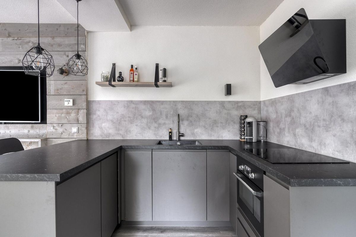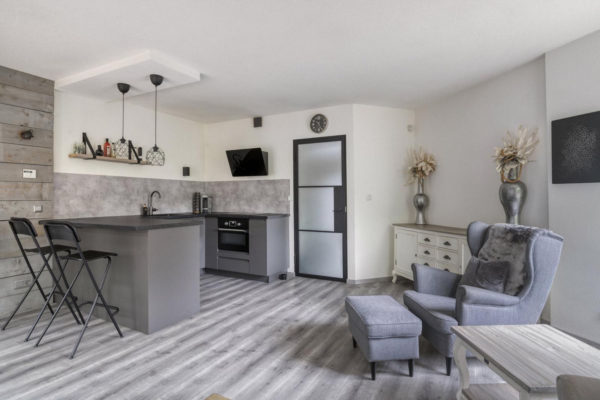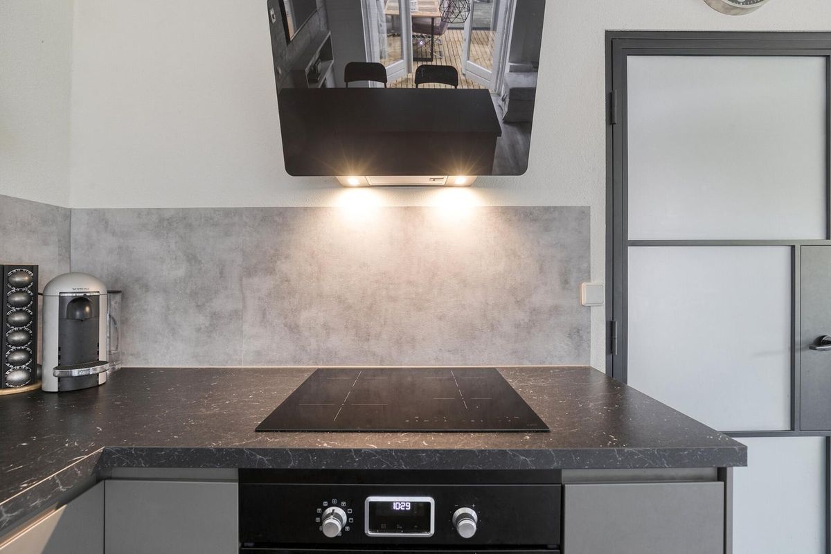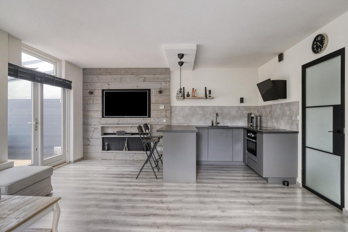 De open keuken in U-opstelling (slechts 3 jaar oud) is uitgevoerd in een moderne grijze kleurstelling en voorzien van diverse inbouwapparatuur: inductiekookplaat, afzuigkap, combi-oven-magnetron, koelkast en vaatwasser. De gehele begane grond is afgewerkt met een nette laminaatvloer.