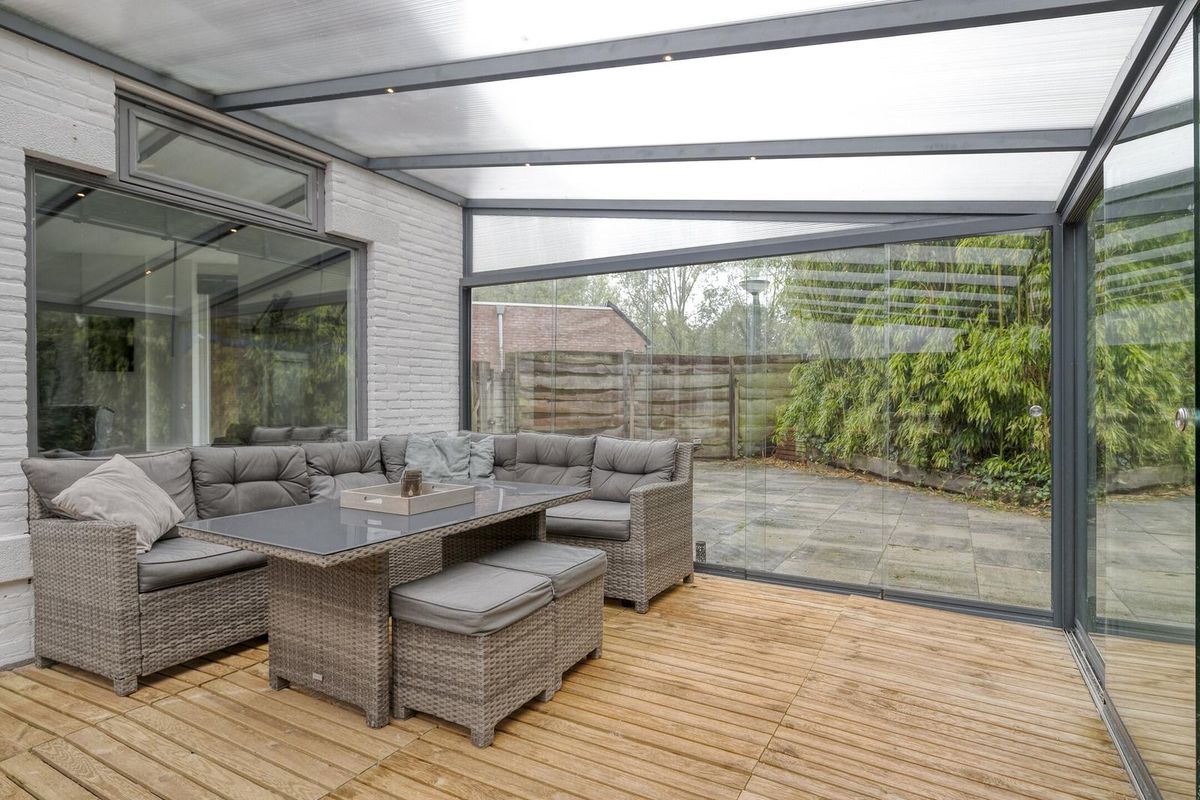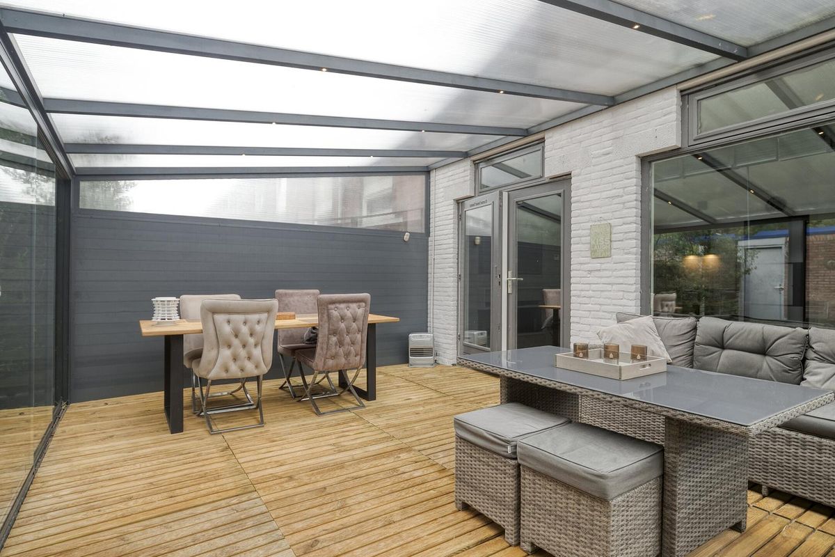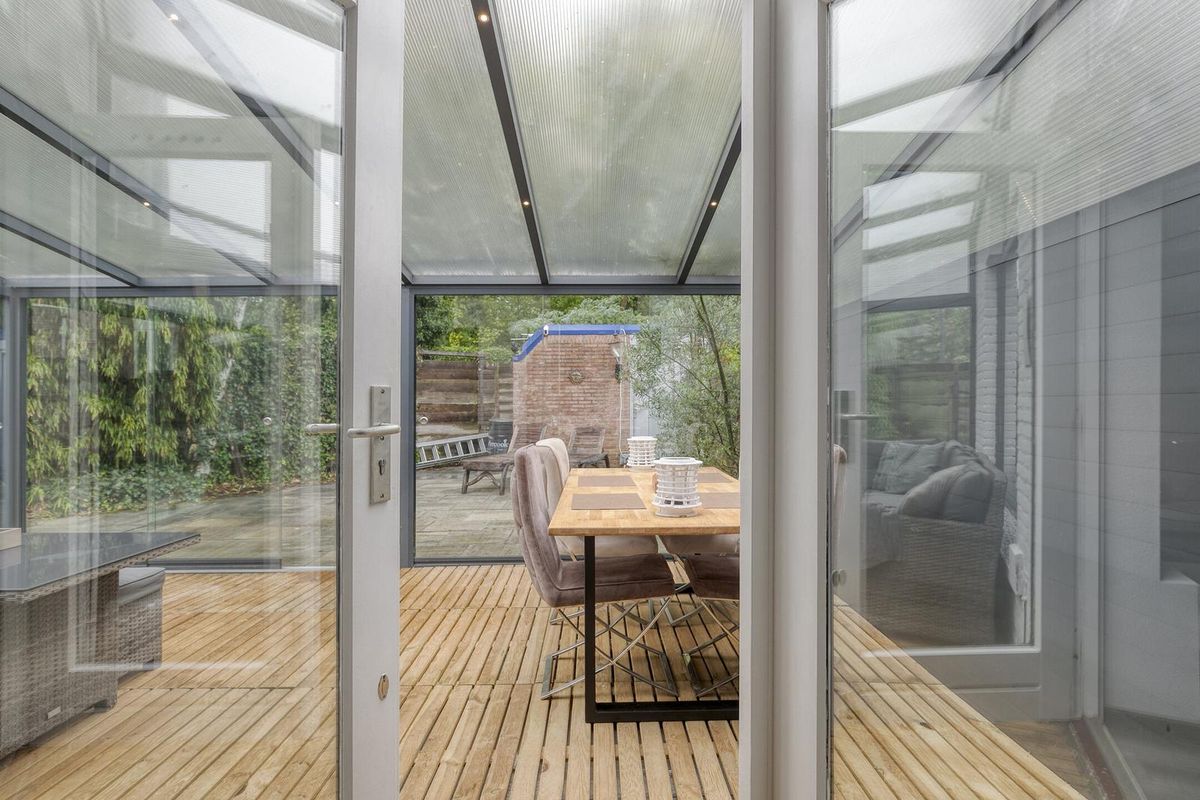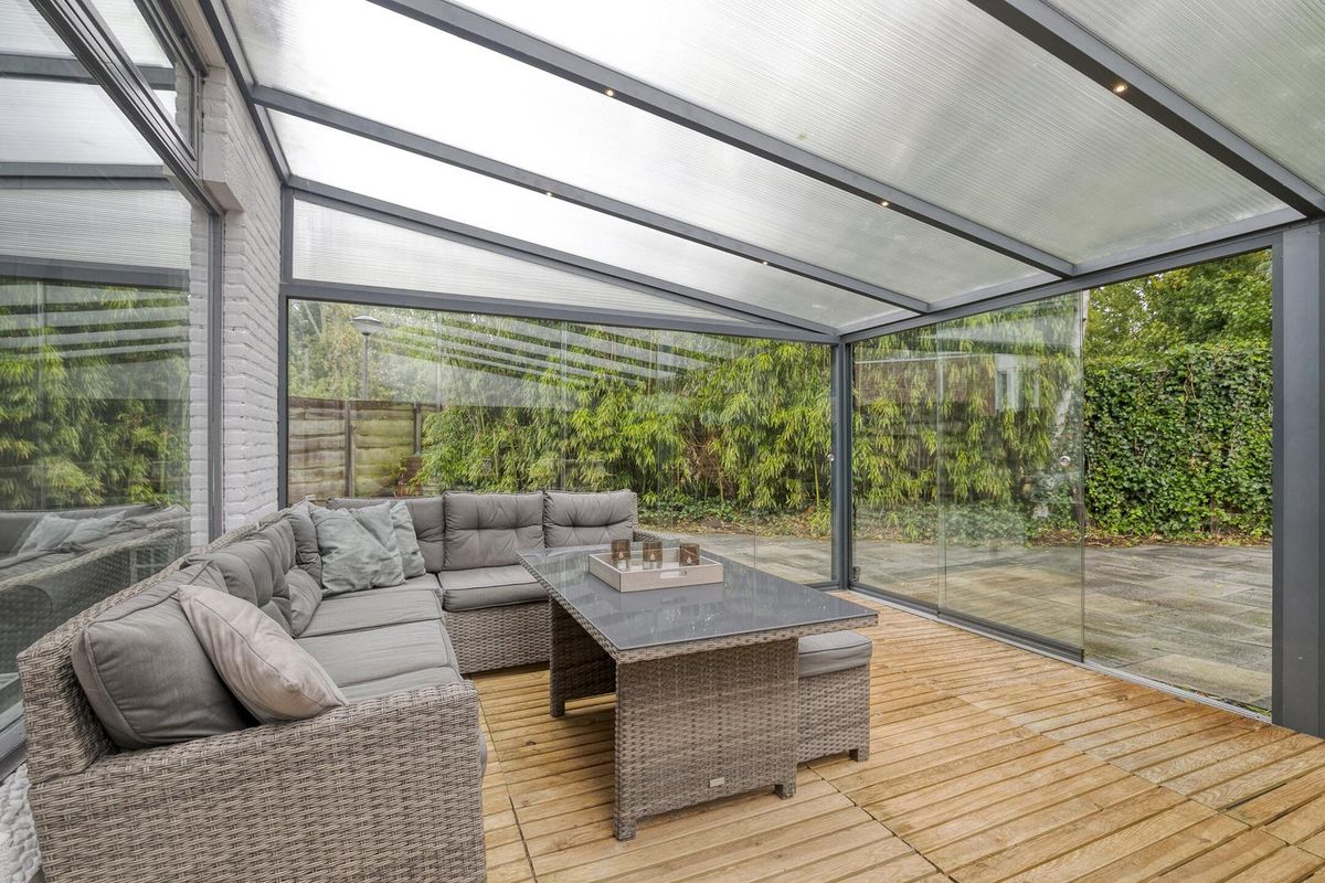 De woonkamer beschikt over openslaande deuren naar de aangebouwde glazen serre van circa 21 m². Deze serre, voorzien van schuifdeuren aan twee zijden, biedt volop mogelijkheden voor een extra zithoek én eettafel. Bovendien is het een heerlijke plek om in de zomeravonden ontspannen te zitten en te genieten van de rust van de tuin. Vanuit hier loop je de royale achtertuin in, waar je eveneens kunt genieten van lange zomeravonden. Achterin de tuin vind je een vrijstaande stenen berging en een achterom.