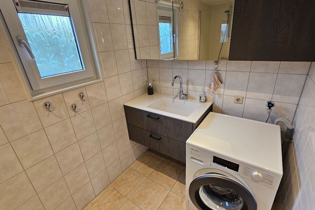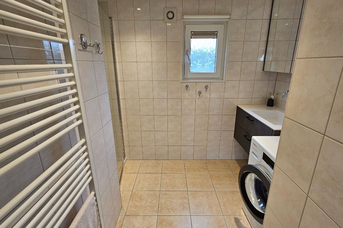 De ruime badkamer is volledig betegeld in lichte kleurstelling en is voorzien van een inloopdouche met thermostaatkraan, badkamermeubel (2023), design radiator, aansluiting voor wasmachine en droger, elektrische ventilatie en ventilatieraam.