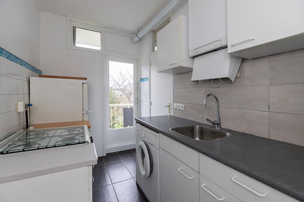De dichte keuken in rechte opstelling beschikt over een gasfornuis met oven, koel-vriescombinatie, cv ketel met warmwatervoorziening (2020) en de aansluiting voor de wasmachine. Vanuit hier heb je toegang tot het balkon op het oosten.