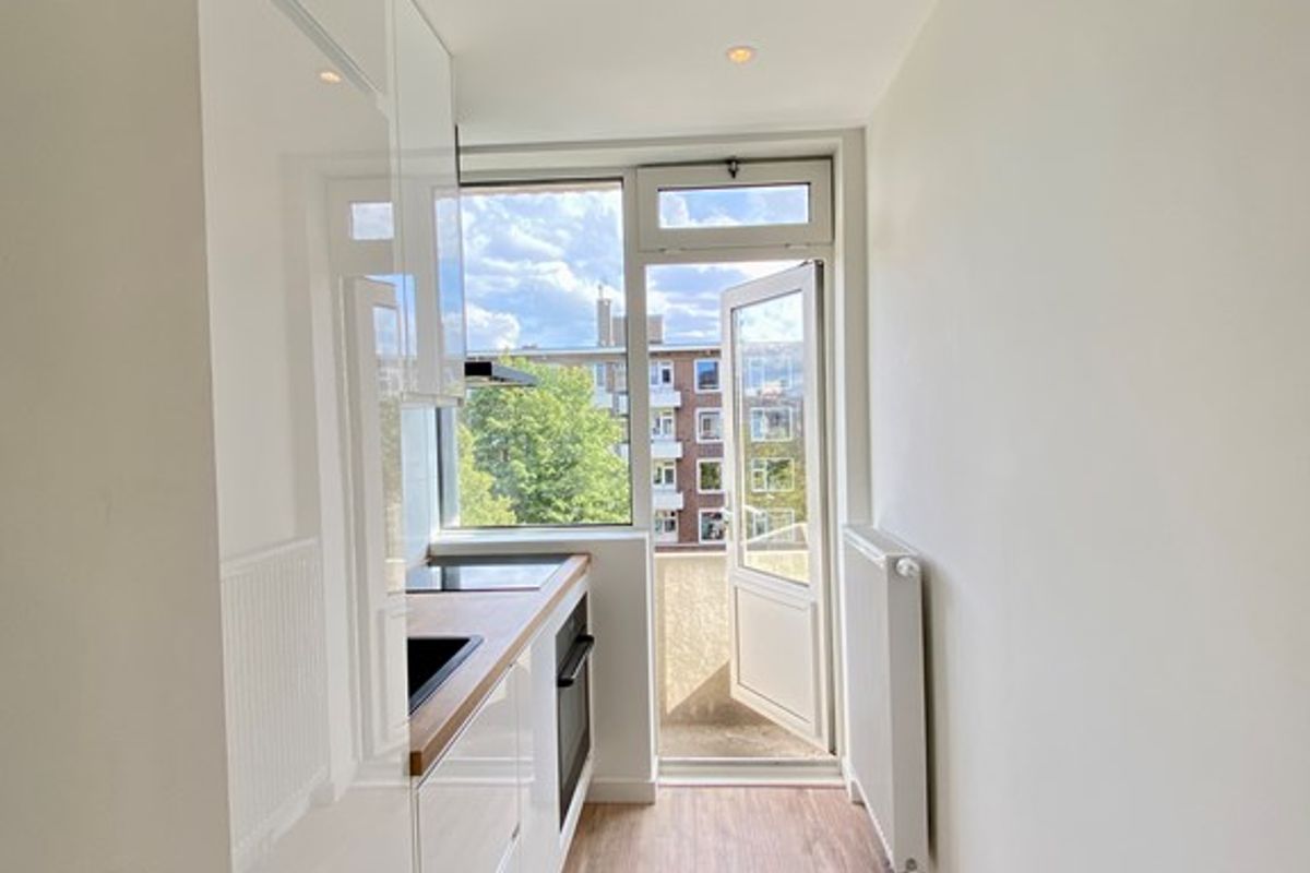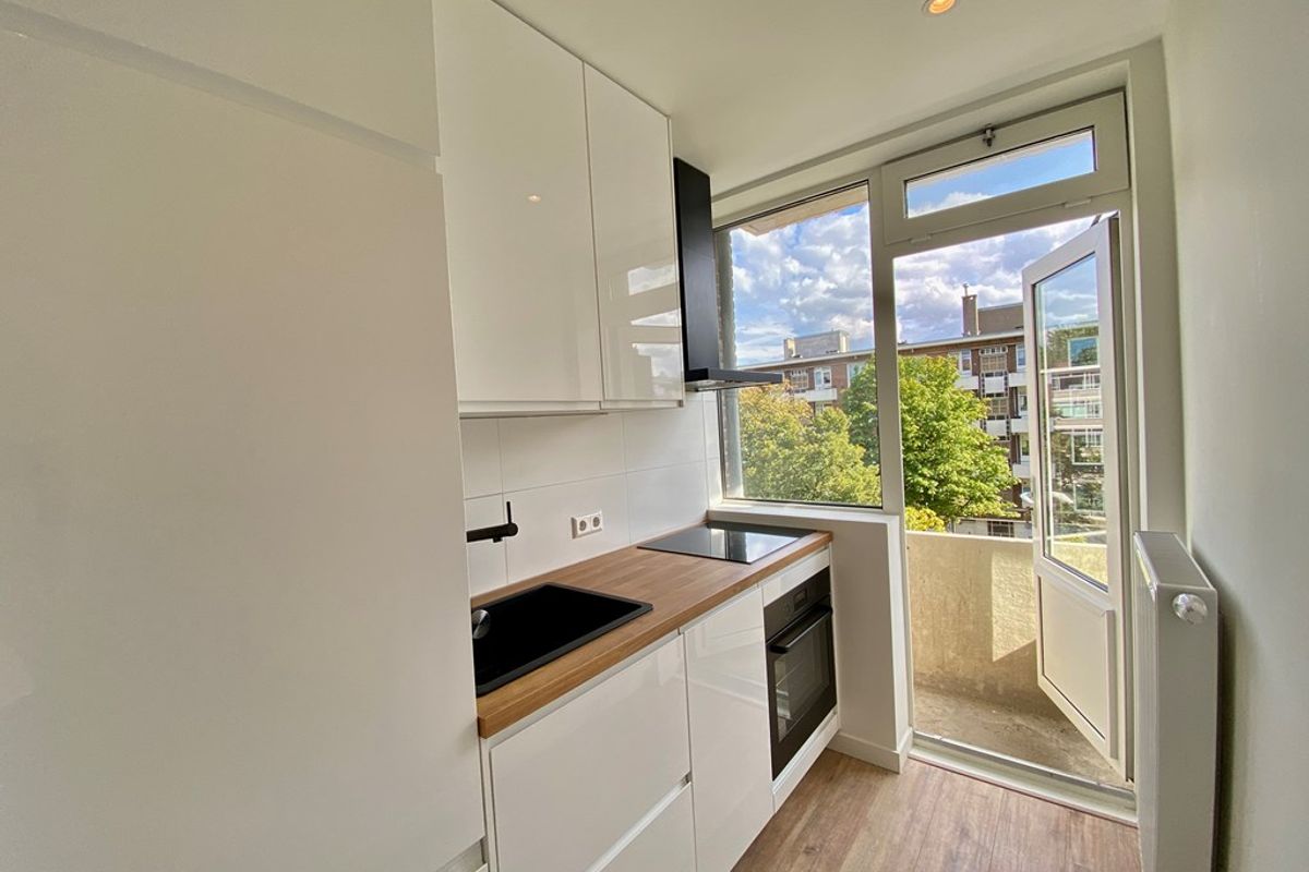 De keuken is voorzien van een moderne keuken met onder andere een koelkast met vriesvak, oven, kookplaat en vaatwasser. De keuken biedt toegang tot het balkon aan de voorzijde.