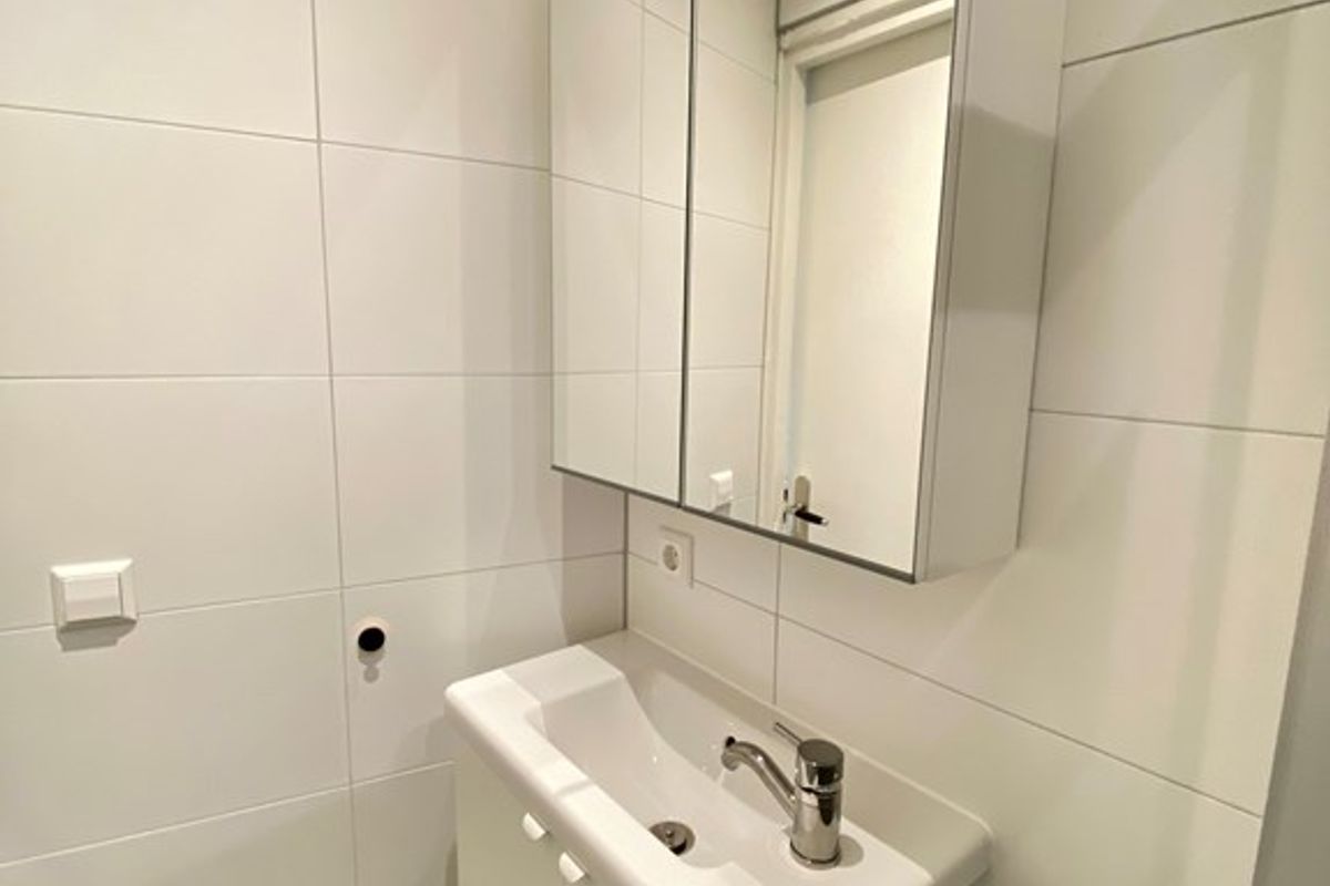 De badkamer is volledig betegeld en voorzien van een wastafelmeubel en nette douche.