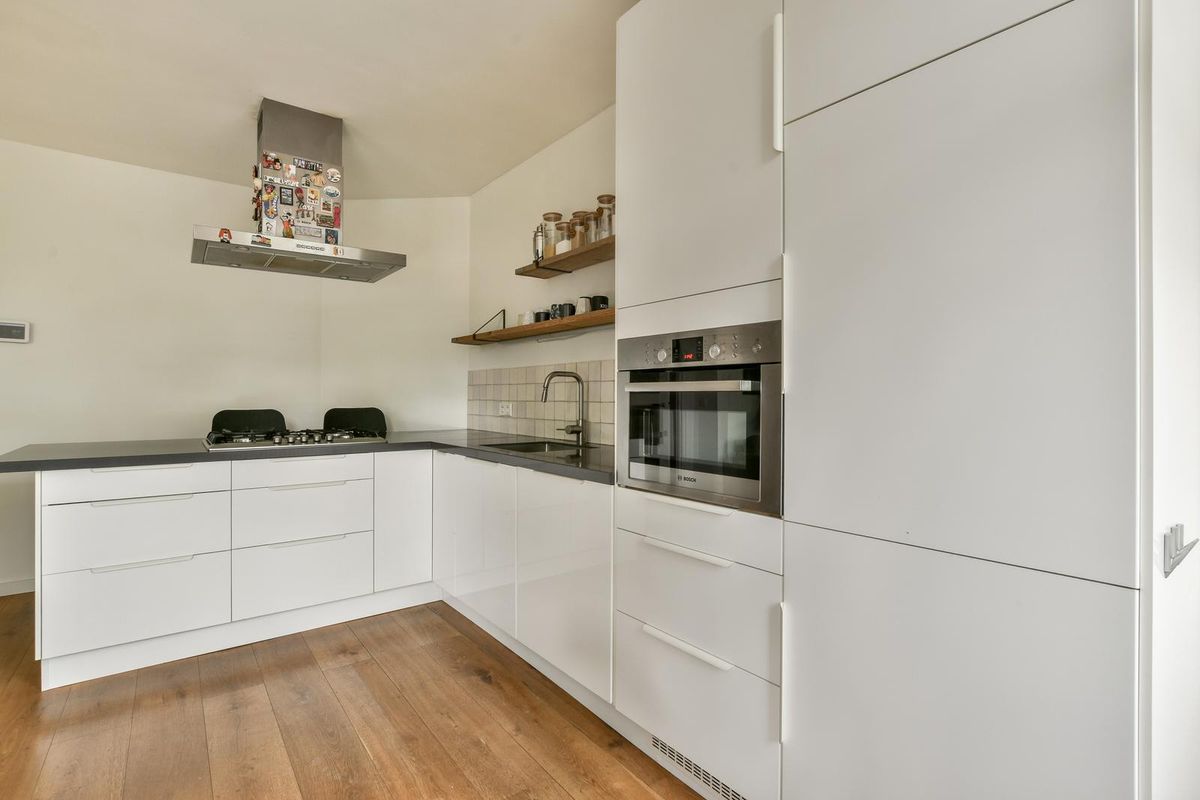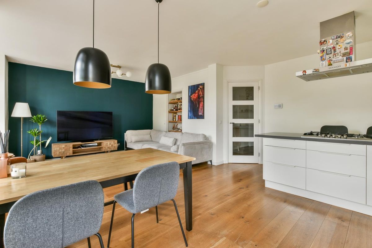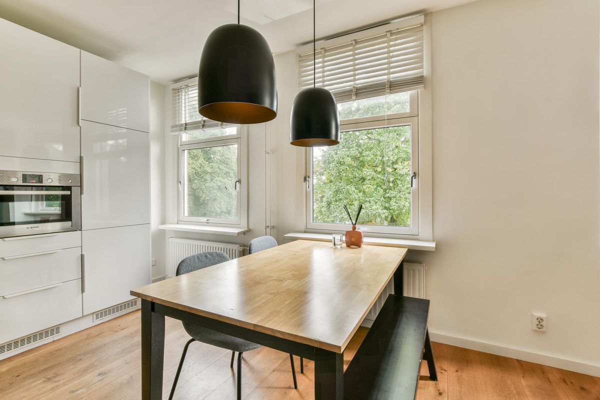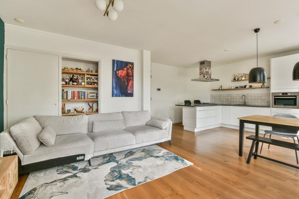 Vanaf de entree kom je in een ruime hal met volop opbergmogelijkheden, vanwaar alle vertrekken toegankelijk zijn. In de woonkamer valt de riante keuken met bar direct op. Rechts is plek voor een comfortabele zithoek; aan deze zijde geeft de erker extra karakter en licht. Een royale inbouwkast biedt praktische bergruimte en door de vele ramen stroomt het daglicht rijkelijk binnen. Vanuit de hele ruimte is er een fraai uitzicht over de Admiralengracht met de groene oever. De open keuken met kookeiland is uitgerust met Bosch inbouwapparatuur en een 5-pits gaskookplaat.