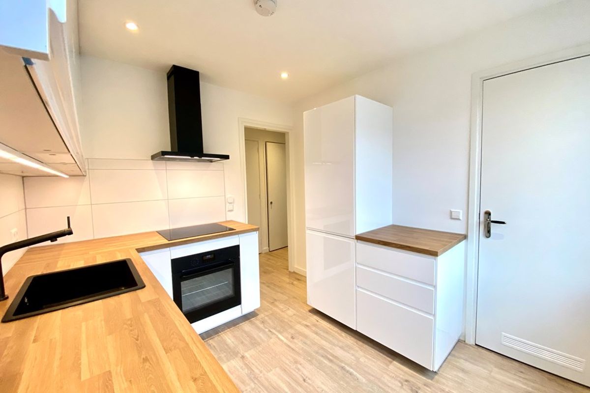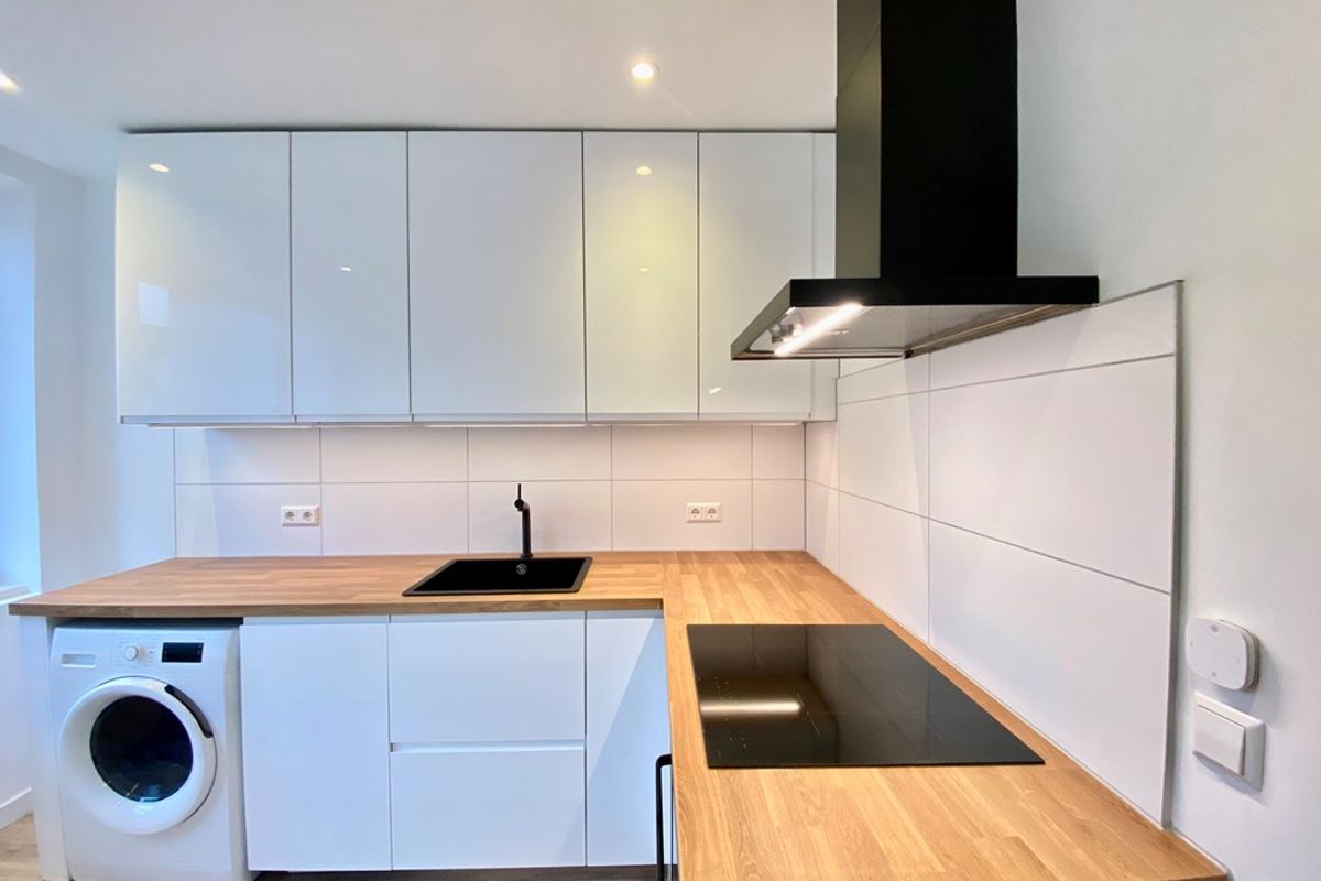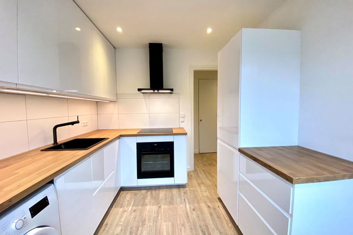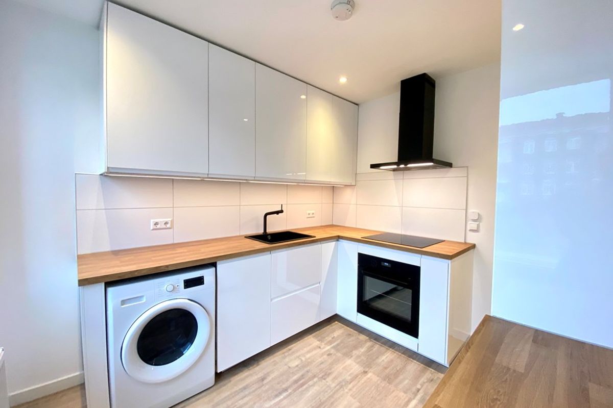 De keuken ligt aan de achterzijde en is voorzien van een koelkast, vriezer, wasmachine, inductiekookplaat, oven en een vaatwasser.