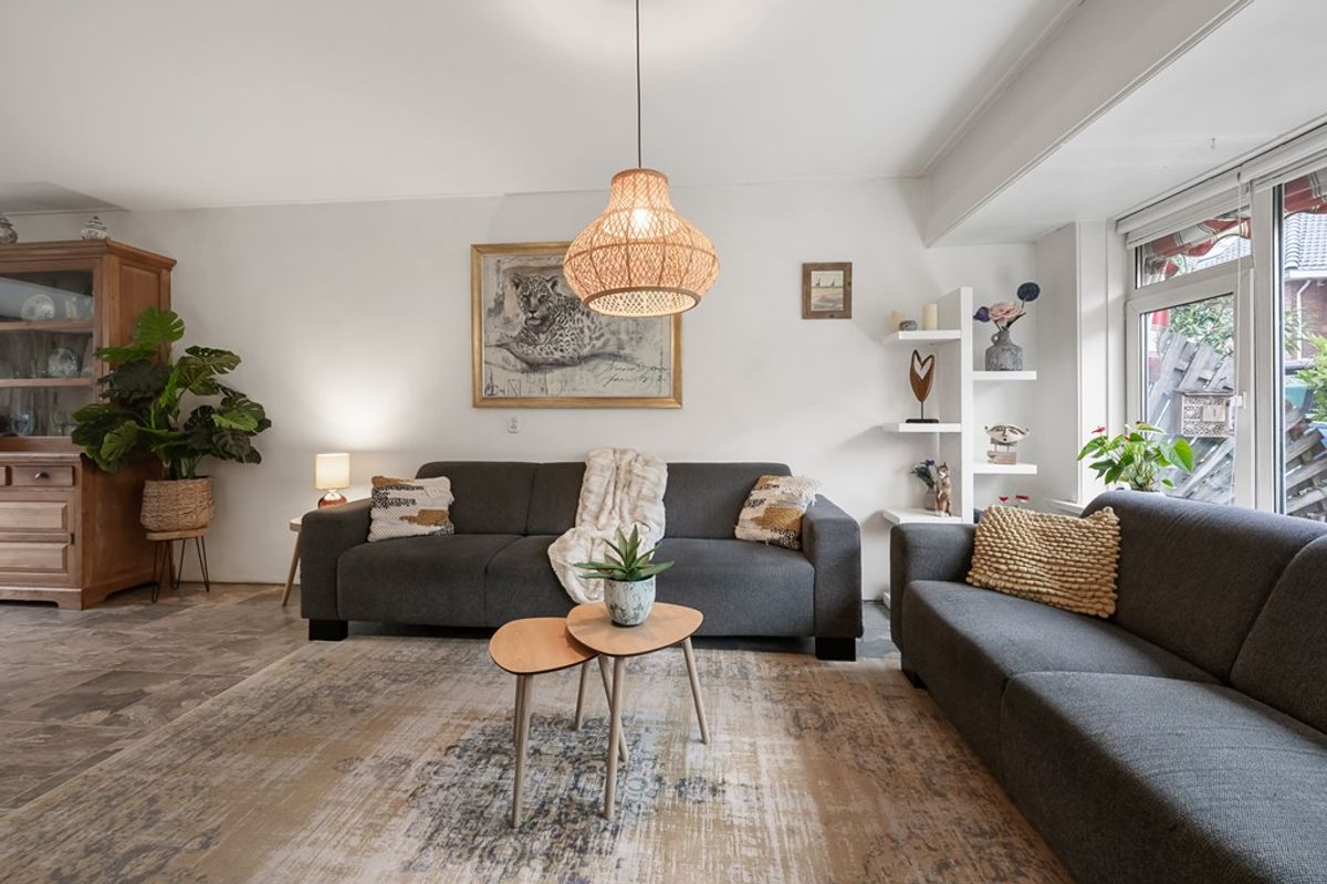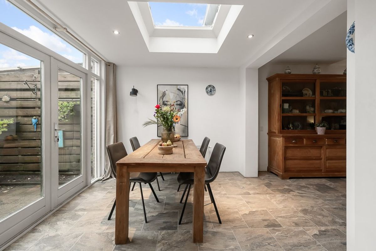 De woonkamer is een echte sfeermaker: dankzij de erker valt het licht prachtig naar binnen en de uitbouw met lichtkoepel zorgt voor extra ruimte en een mooi open leefgedeelte. De openslaande deuren naar de tuin maken het woongeluk compleet, binnen en buiten lopen hier moeiteloos in elkaar over.