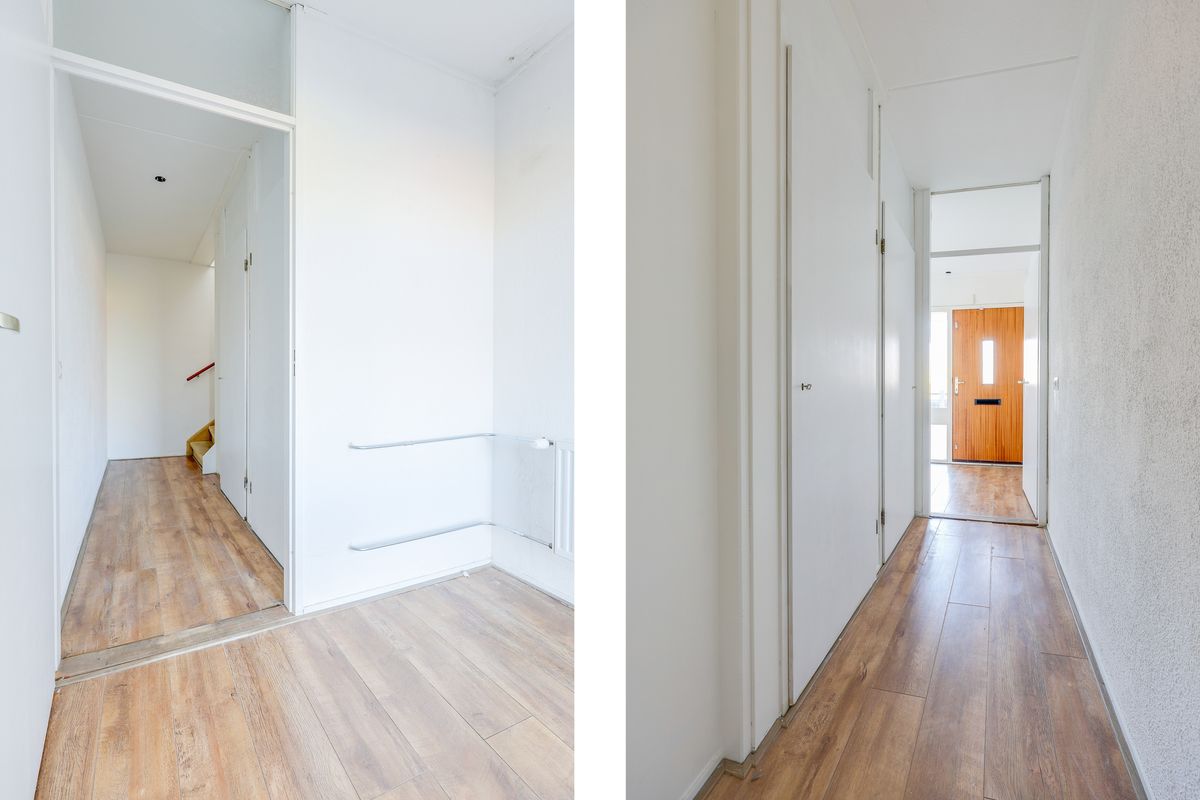 Je komt binnen in een ruime hal met meterkast, garderobekast en trapopgang naar de woonverdieping.