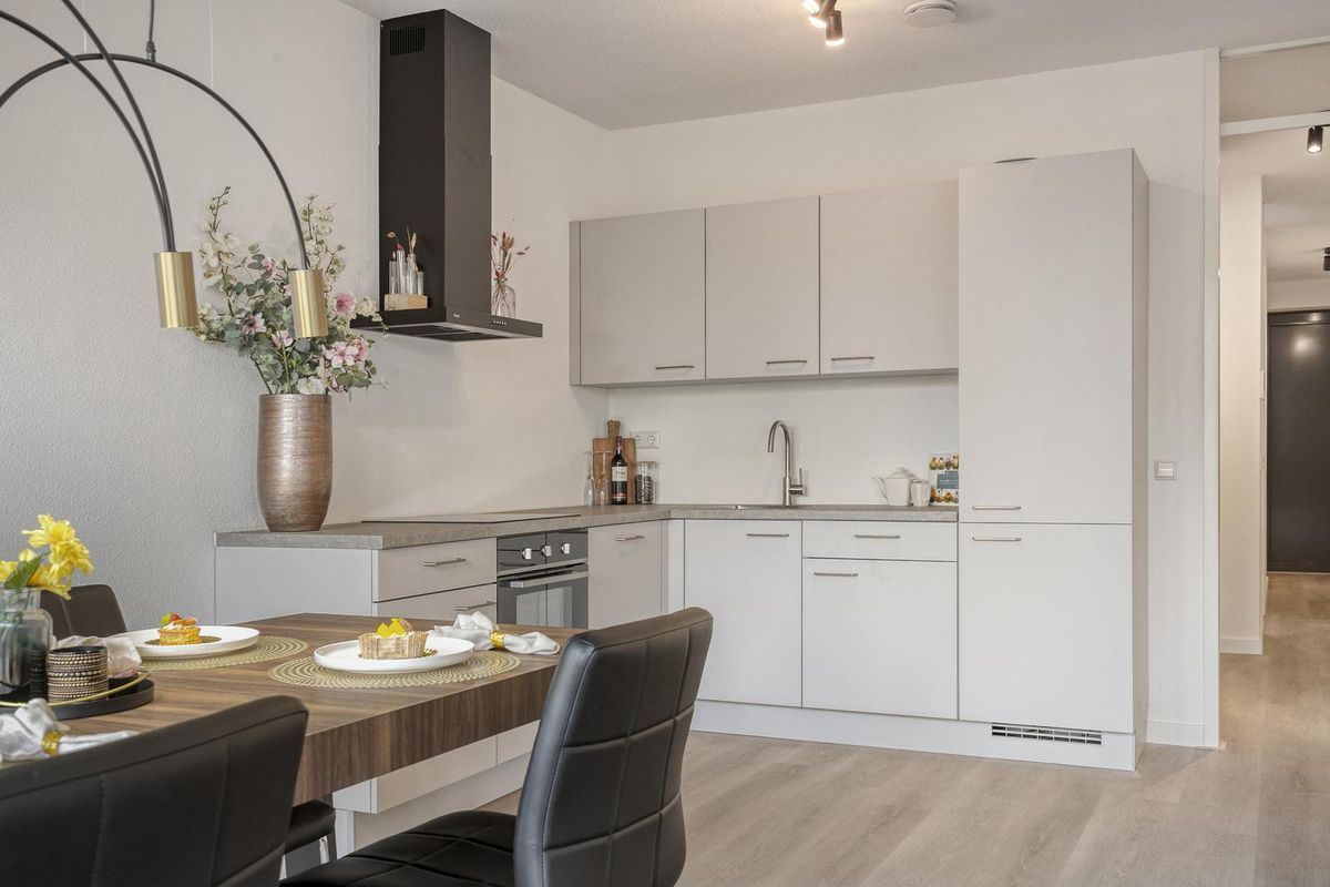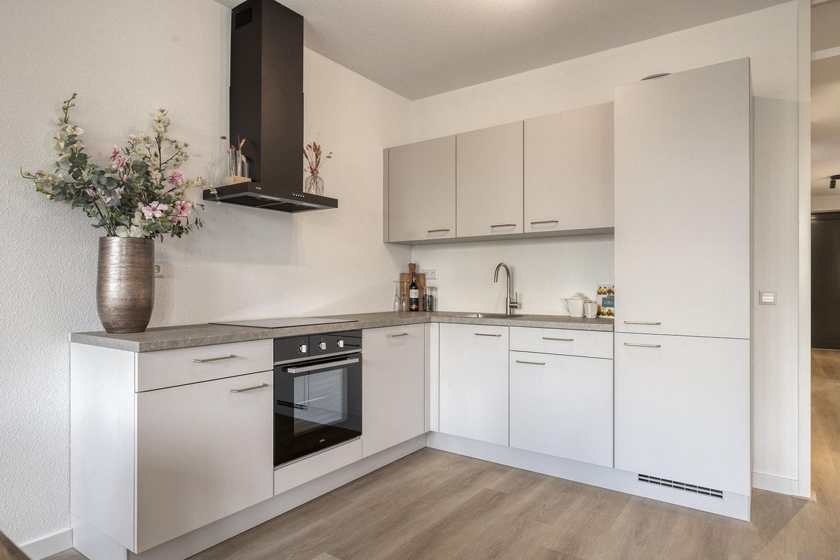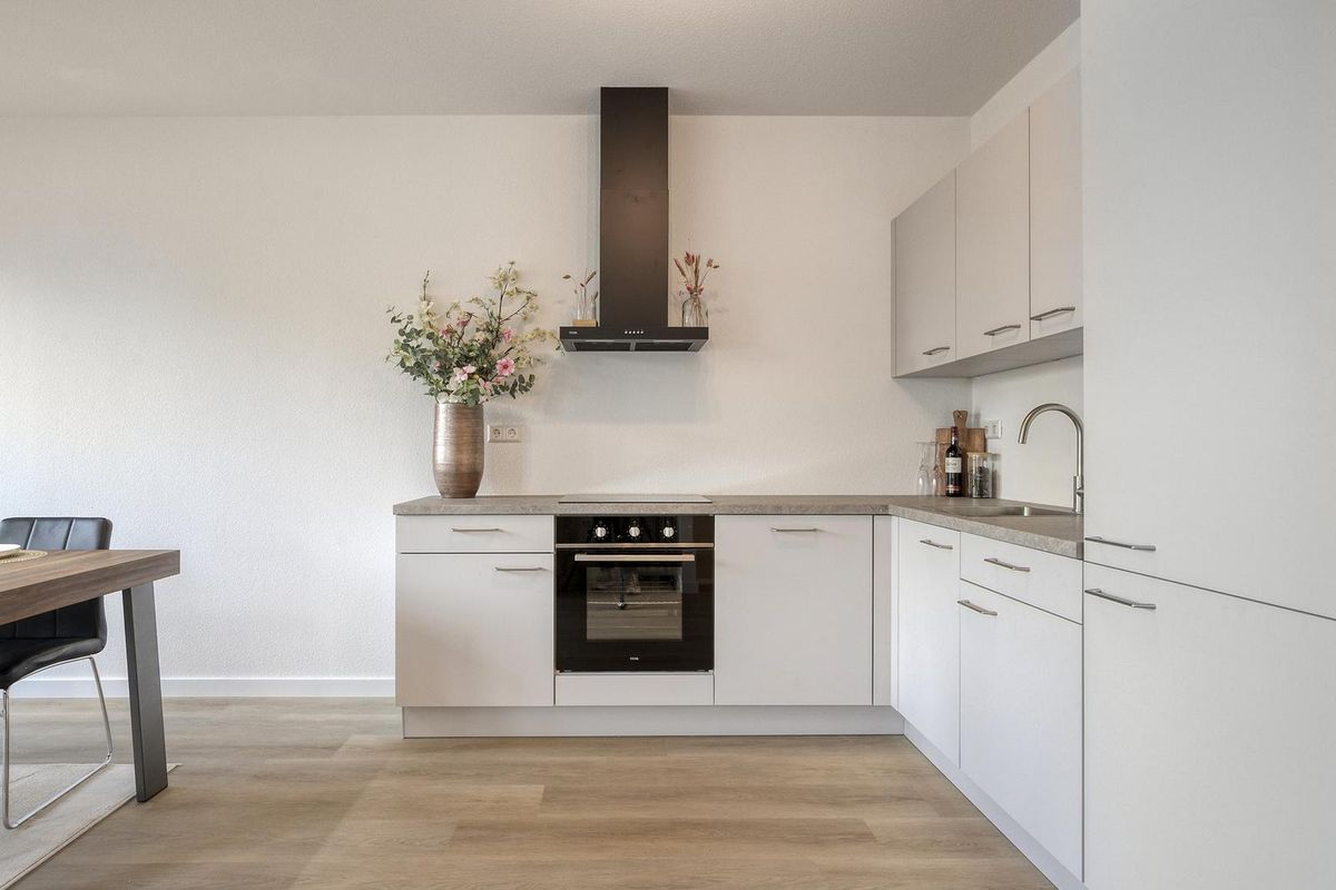 Open keuken voorzien van inductiekookplaat met afzuigkap, combi-oven, vaatwasser en koel-/vriescombinatie
