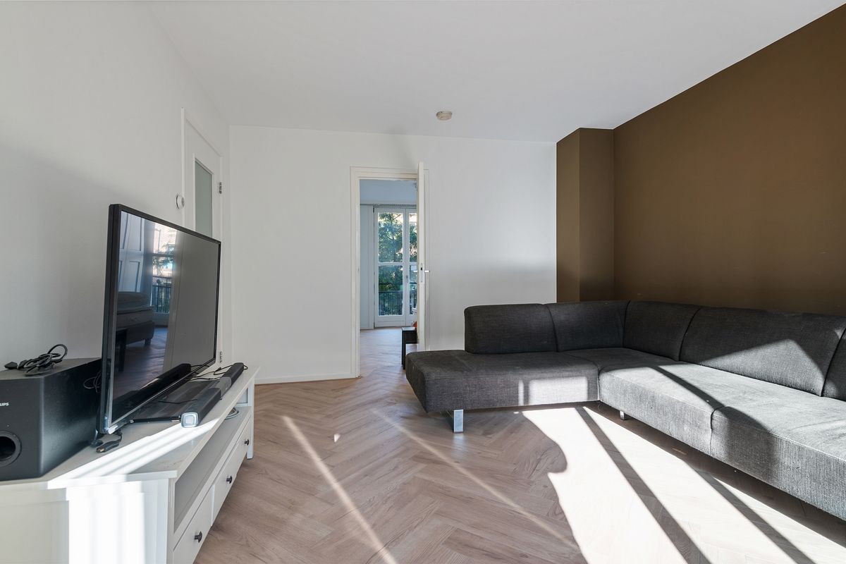 De ruime en strak afgewerkte woonkamer beschikt over veel lichtinval dankzij de grote ramen. De moderne inrichting met een comfortabele hoekbank en tv-meubel zorgt direct voor een huiselijk gevoel. Via de woonkamer heb je toegang tot een zonnig balkon. Perfect om te genieten van je ochtendkoffie of een borrel in de namiddag, met uitzicht op groen en omliggende bebouwing.