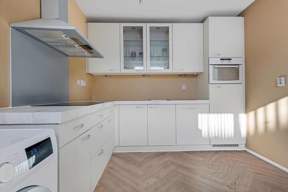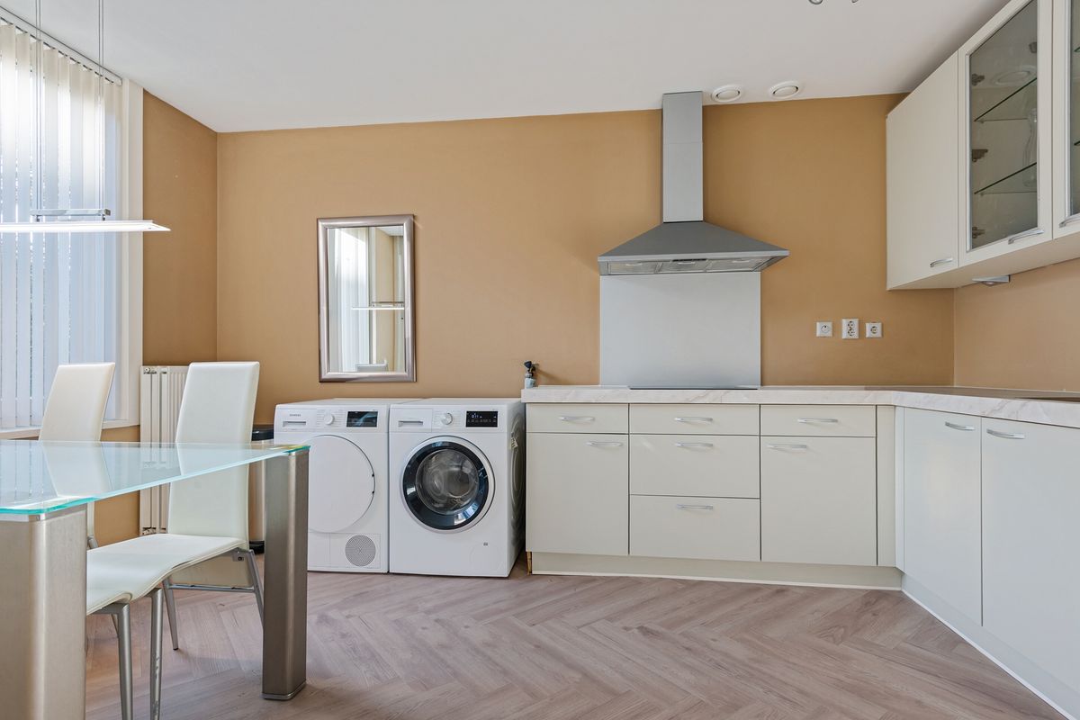 De moderne open keuken is uitgerust met inbouwapparatuur, een wasmachine én een droger – ideaal voor dagelijks gemak. Er is voldoende kastruimte, een luxe afzuigkap en een nette afwerking. Het eetgedeelte biedt ruimte voor een grote eettafel en is sfeervol verlicht.