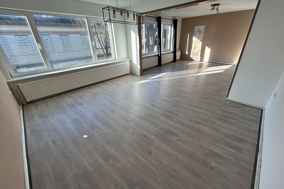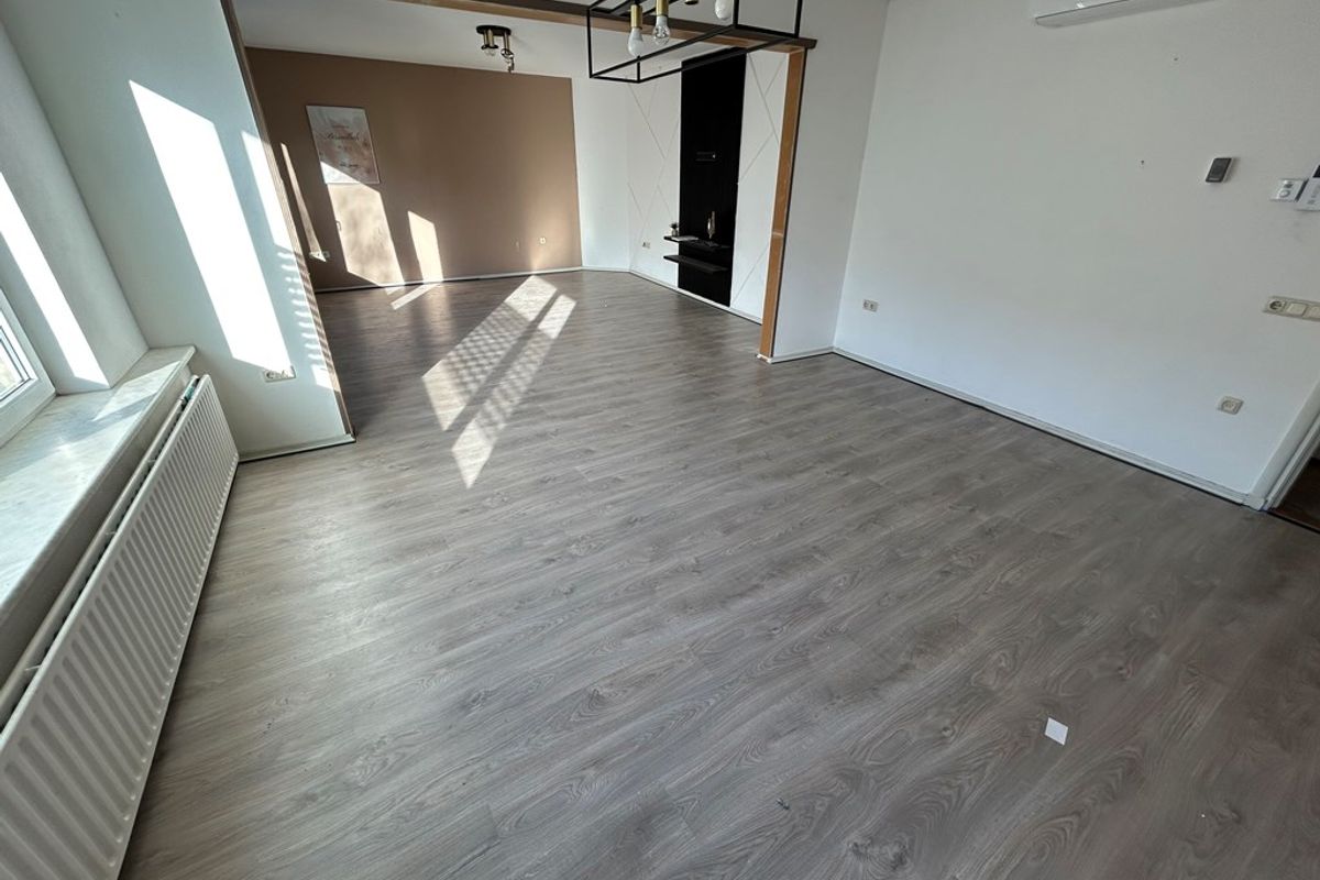 Woonkamer 8,90 x 4,70 met laminaatvloer en airco.