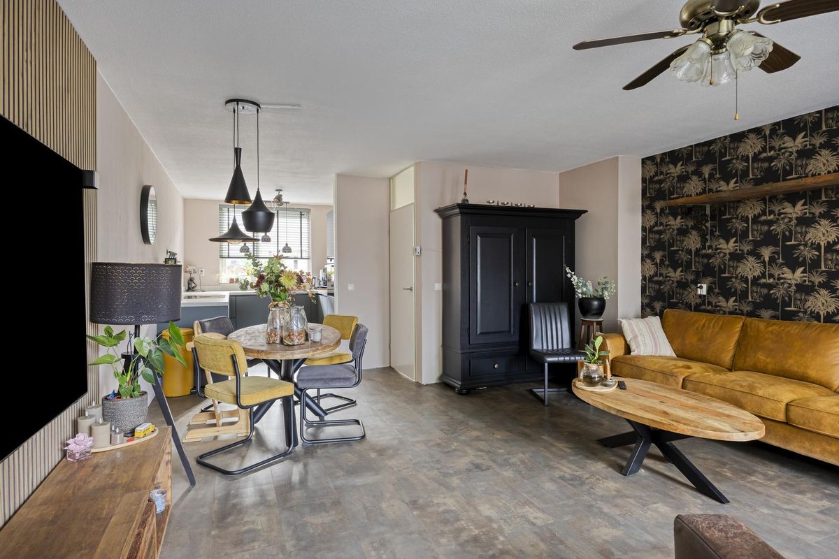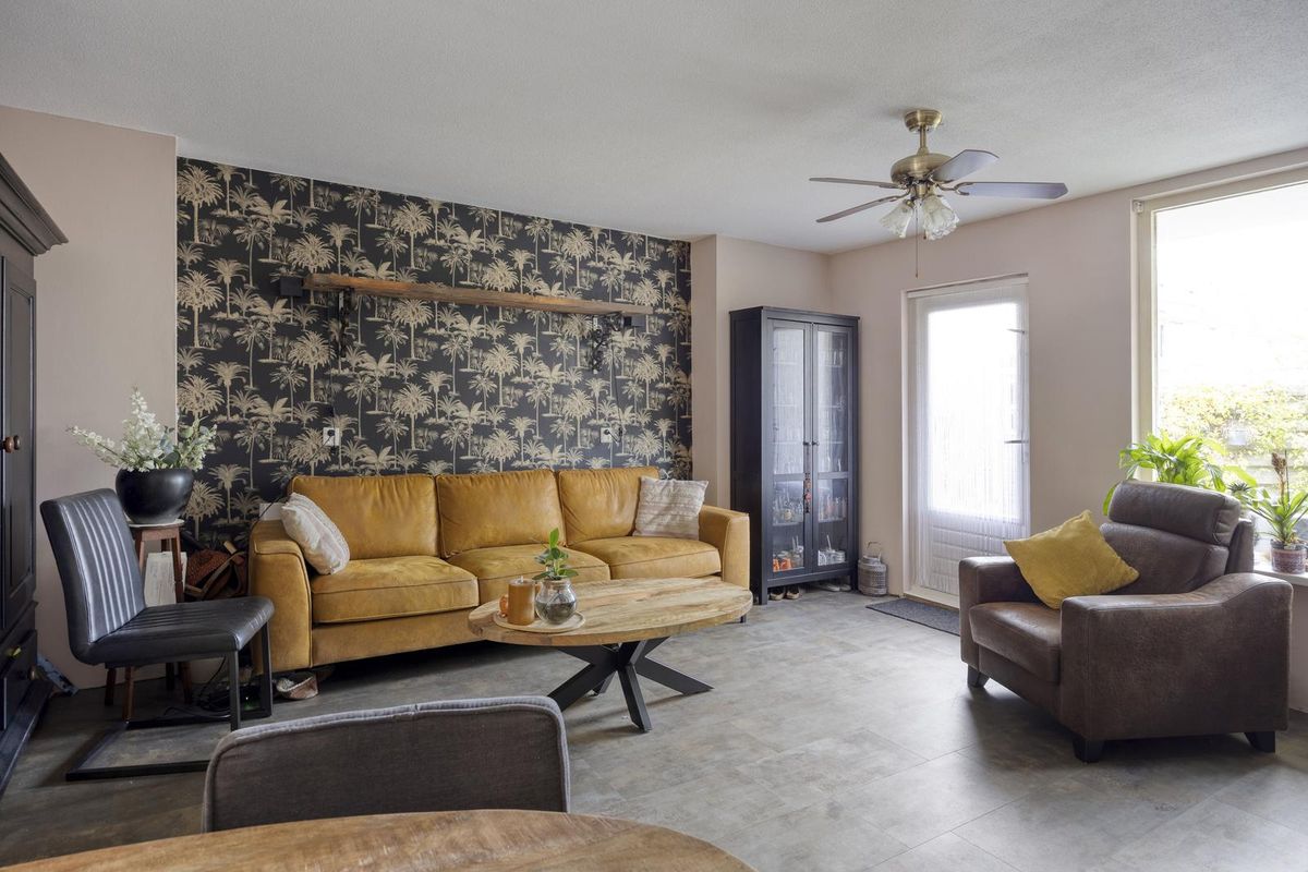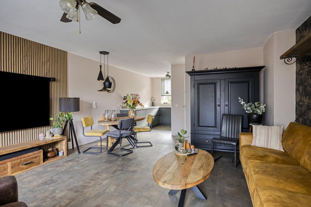 De woonkamer is gelegen aan de achterzijde van de woning en heeft een grote raampartij. De wanden zijn gestuukt en deels afgewerkt met fraaie akoestische panelen. De PVC vloer is v.v. vloerverwarming. Vanuit de woonkamer is er middels een deur toegang tot de tuin.