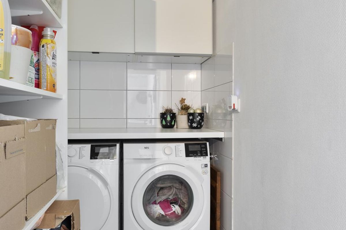 Separate, betegelde wasruimte voor de opstelplaats van de wasmachine en wasdroger. De ruimte met plavuizen vloer biedt tevens bergruimte.