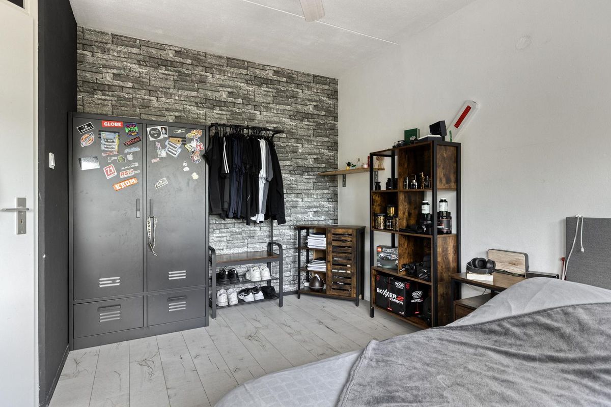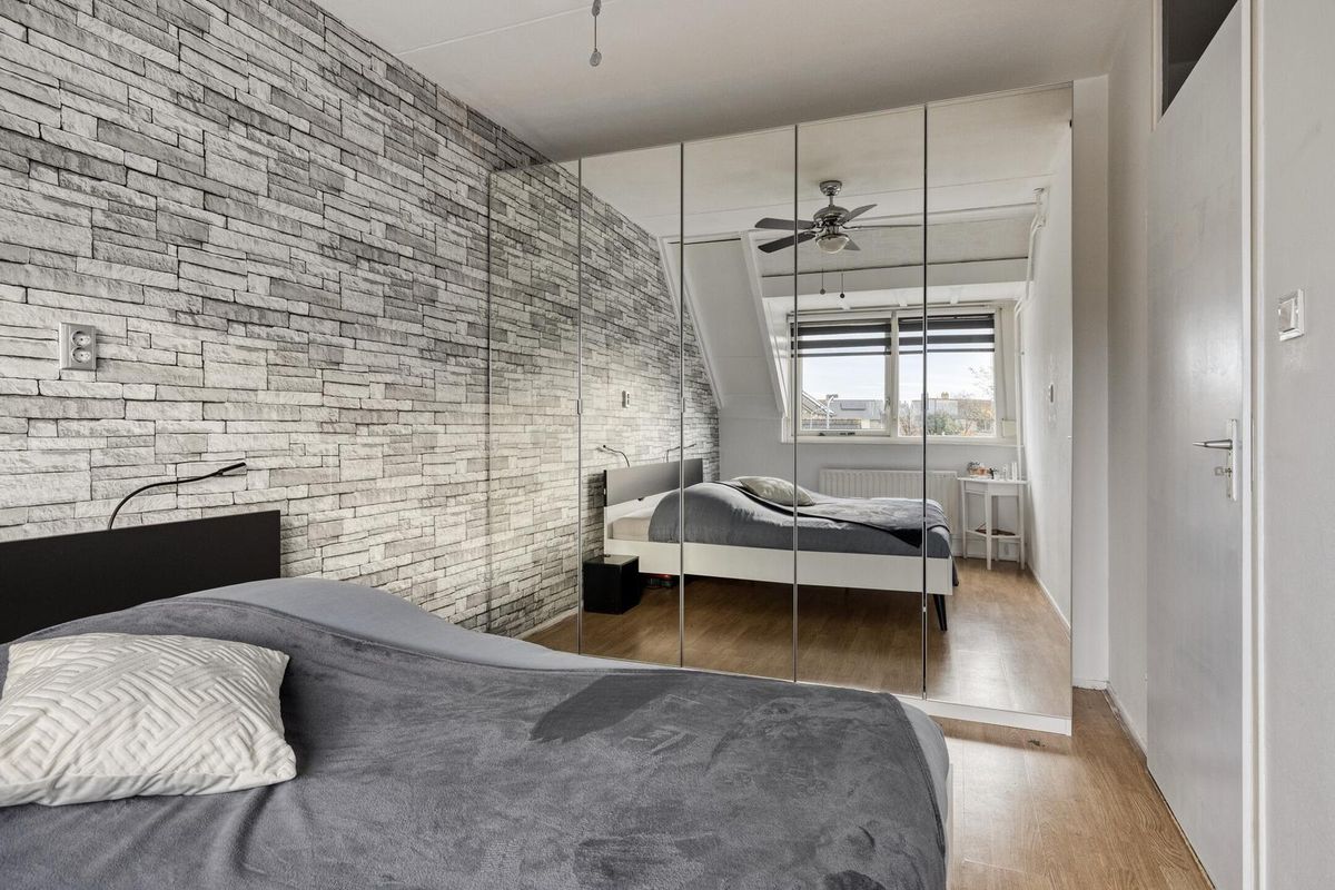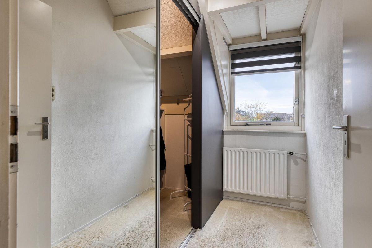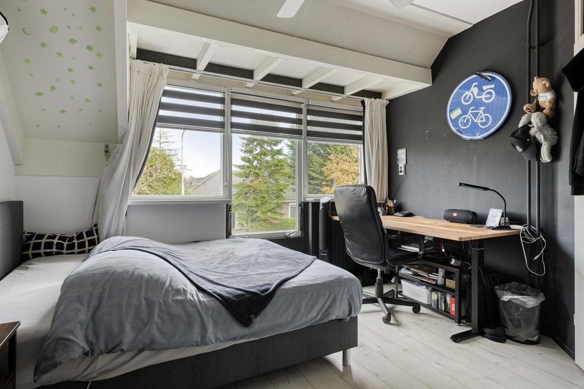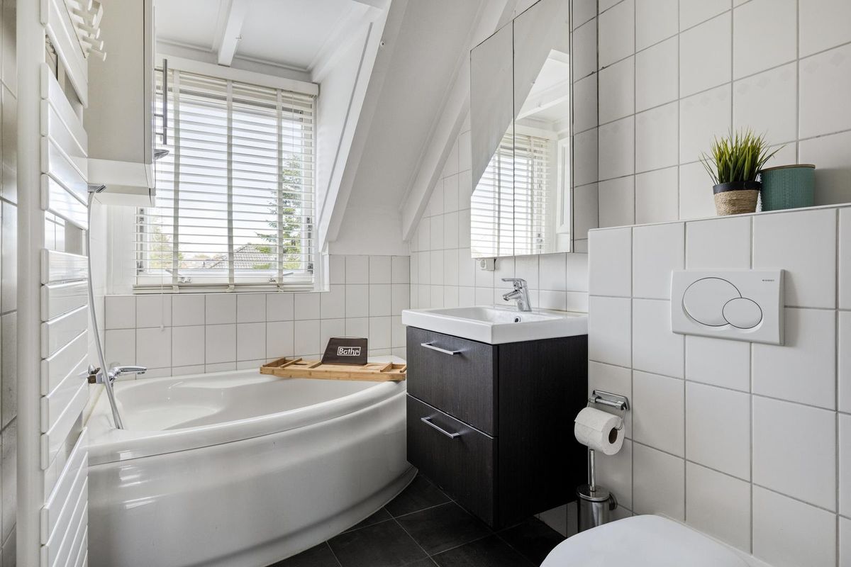 Op de eerste etage vinden we twee ruime slaapkamers, één kleinere slaapkamer annex inloopkast én de badkamer. De grote slaapkamers zijn beiden zo’n 12 m2 en bevinden zich aan de rechterzijde van het huis. Deze kamers bieden voldoende plek voor een tweepersoonsbed en een grote kledingkast. De derde slaapkamer op deze woonlaag is in gebruik als handige inloopkast met schuifdeur, maar kan desgewenst ook als (kleinere) slaapkamer fungeren.