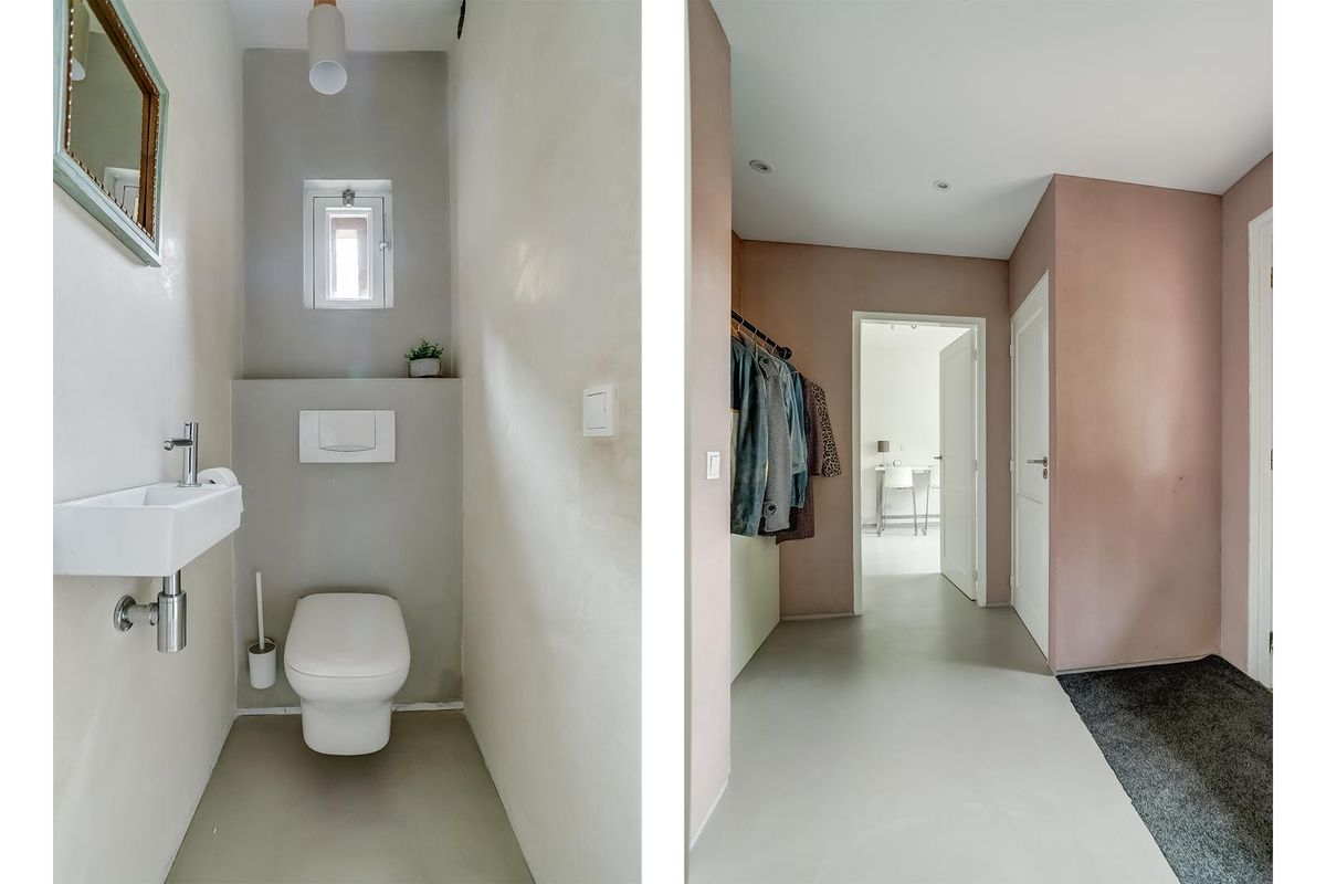 U komt binnen in een ruime hal met garderobe, meterkast, modern toilet en toegang tot de woonkamer en slaapkamer met badkamer en suite.