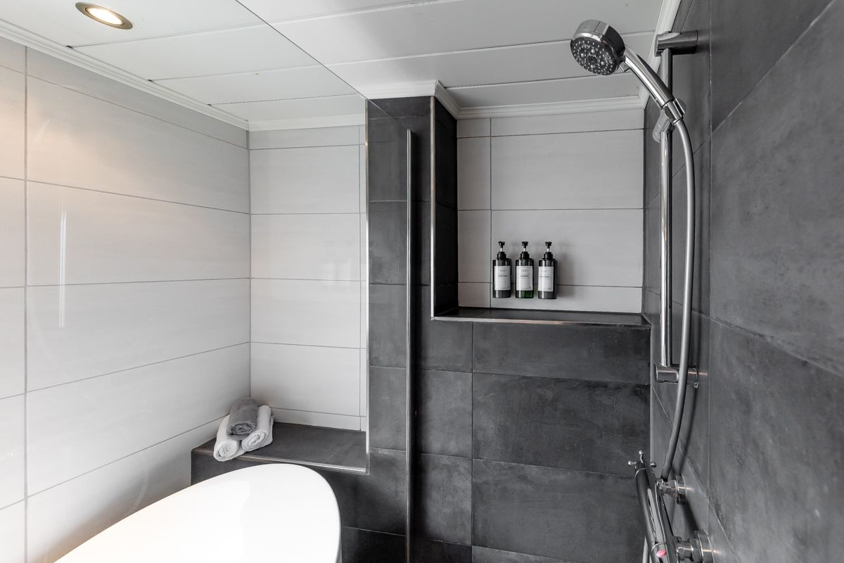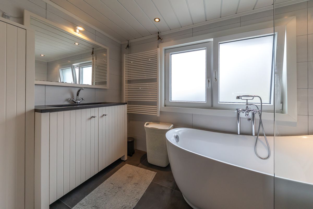 - Badkamer met ligbad, douche, wastafel en mechanische ventilatie