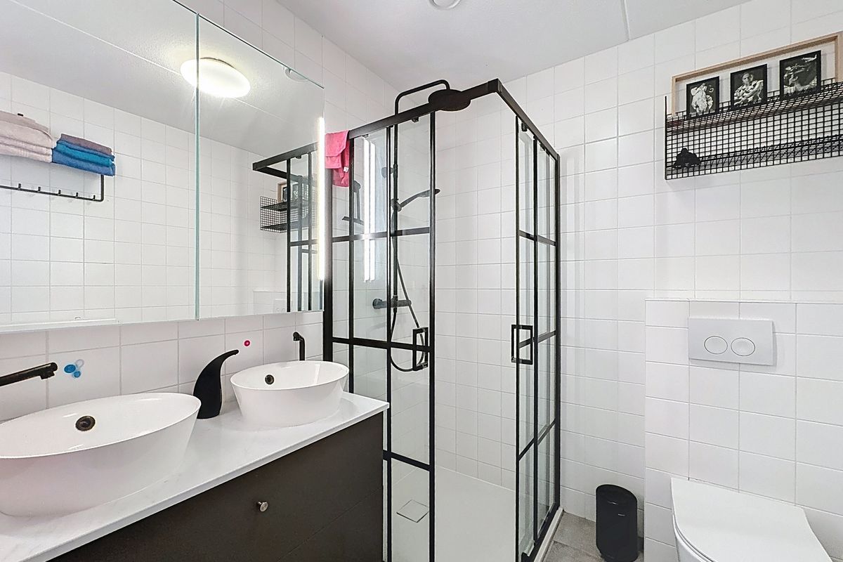 De badkamer op de eerste verdieping beschikt over een dubbele wastafel, een inloopdouche en een toilet.