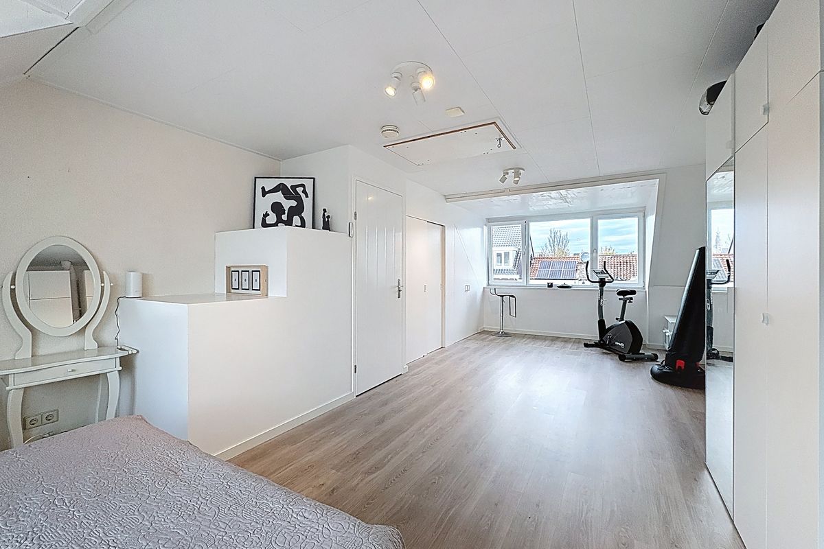 De zolderverdieping biedt een zeer ruime slaapkamer met veel opbergruimte en voldoende plek voor een kleine thuisgym of hobbyruimte.