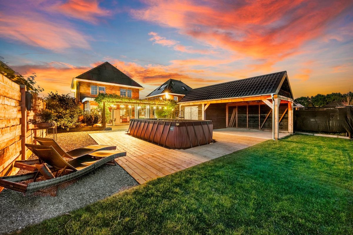 Fraai aangelegde tuin rondom de woning welke direct grenst aan stadsgracht. De tuin beschikt over een luxe veranda van formaat met een zadeldak lichtstraat. Het fraaie vlonderterras bij het zwembad en de diverse beplantingen maken het af. De grote vrijstaande houten berging met fraaie overkapping, voorzien van een strak gestorte betonnen vloer, gaat voor vele gezellige momenten zorgen, daar hoeft u niet aan te twijfelen! Aan de voorzijde van de woning is er genoeg parkeergelegenheid op eigen terrein en naast de woning is rekening gehouden met ruimte voor een vouwwagen, aanhangwagen o.i.d, achter af te sluiten poorten natuurlijk.