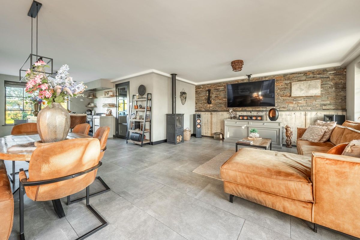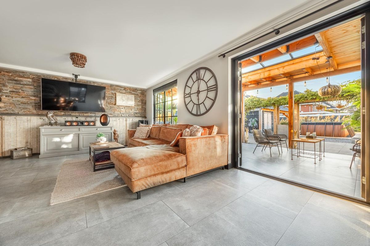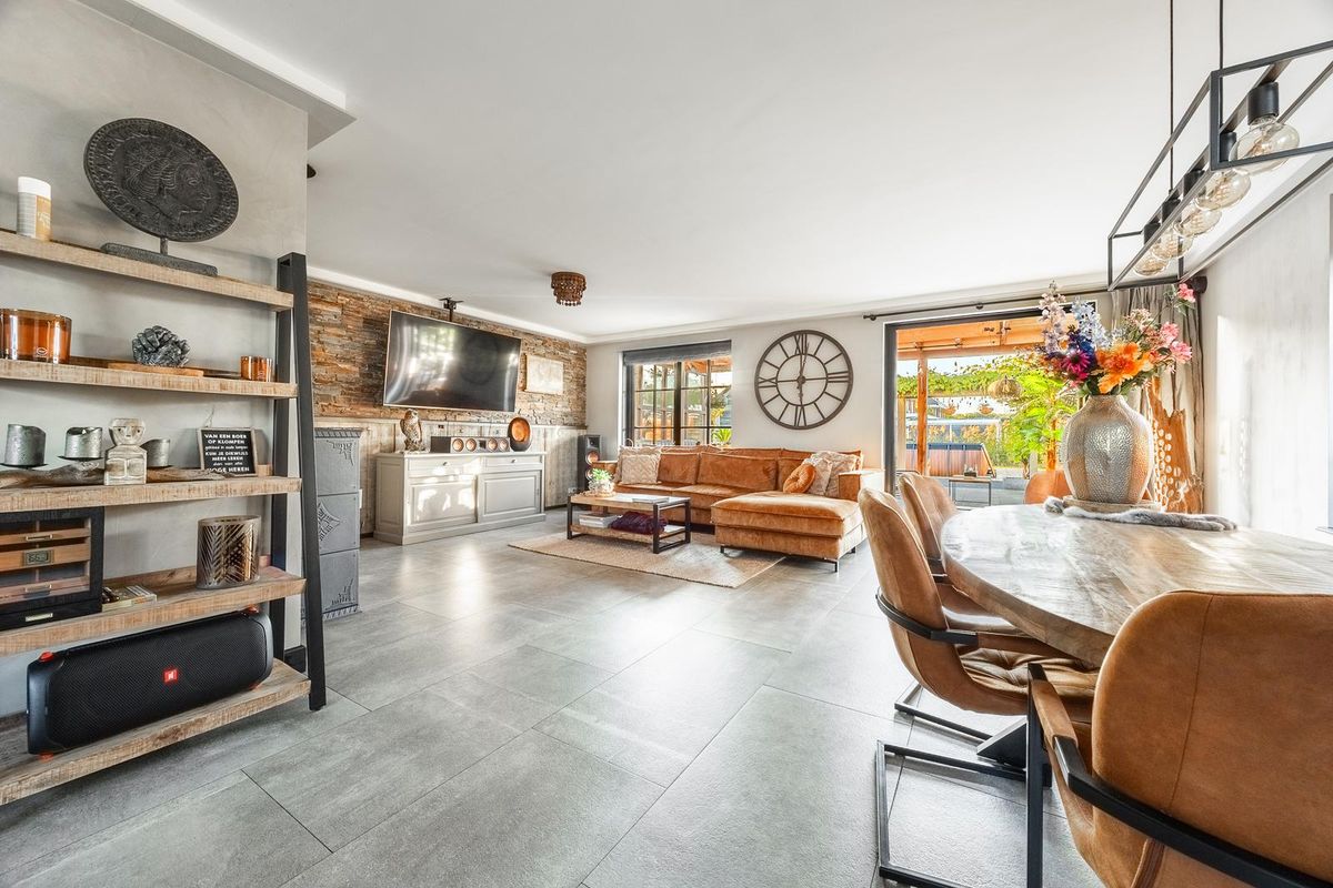 Ruime entree, de hal is gesausd in een rustgevende kleur, met aangrenzend de uitgebreide meterkast, toegang tot de praktijkruimte cq slaapkamer en het chique toilet met licht sensor, zwevend sanitair met krachtige ventilatie en fonteintje. Onder de handgemaakte trap van Essenhout, welke kraakvrij is, treft u de waterontharder & vloerverdeler aan en tevens brengt u deze trap naar de eerste verdieping. Via de chique deur met veiligheidsglas heeft u toegang tot de woonkamer. De ruime woonkamer wordt gekenmerkt door de sfeervolle en vele kruiskozijnen waardoor gedurende de dag het natuurlijke lichtinval vrijspel heeft. Vanuit de woonkamer heeft u middels groot openslaande deuren toegang tot de geïsoleerde veranda met aansluitend de achtertuin. De keuken is er één van formaat. Welke u mag verwachten in een villa van dit segment. Praktisch, luxe en aan één zijde voorzien van, schitterende inbouwapparatuur zoals een bijna niet meer weg te denken wijnklimaatkast met verdekt opgestelde coffeecorner, heteluchtoven, een magnetron, een riante koelkast evenals een separate Amerikaanse koel-vries combinatie. Het middensegment van de keuken bestaat uit de tweepersoonsbar, een handgemaakt betonnen werkblad met spoelbak en Quooker. In dit middensegment treft u de vaatwasser aan, maar ook aan weerskanten een partij aan bergruimte. Aan de andere zijde treft u de parel van de keuken aan, de Smeg, het fornuis op gas met in het plafond weggewerkte afzuiging. Deze bijzondere Smeg is voorzien van 5 kookzones, primaire oven, secundaire oven, grill-oven en opbergvak met lade. Hier bent u geen keukenprins(-es) maar keukenkeizer(-in)! De begane grond is voorzien van een zeer chique tegelvloer, groot formaat, met vloerverwarming en het plafond is afgewerkt met een prachtige koof waarin verlichting is aangebracht.