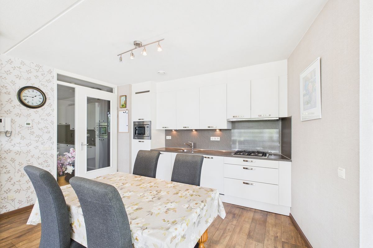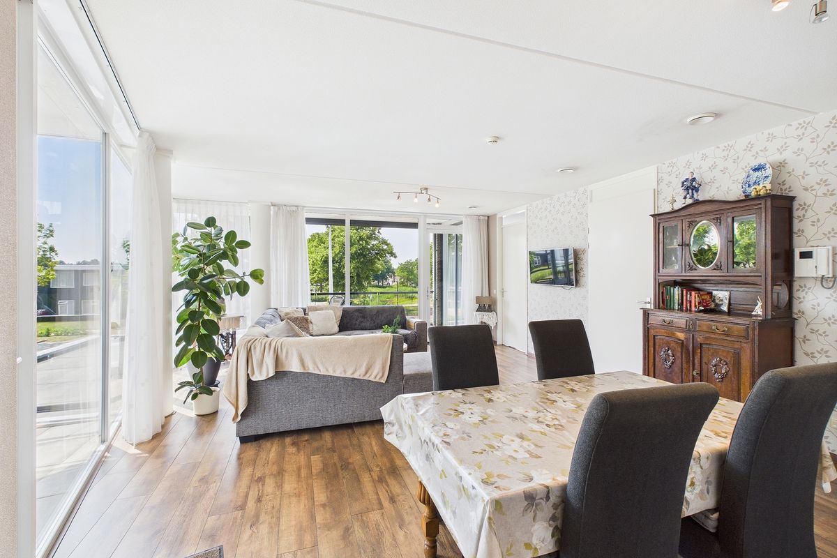 De woonkamer is ruim en dankzij de grote raampartijen opvallend licht. Hier geniet u van een prachtig uitzicht over de vijver. De open keuken is voorzien van diverse